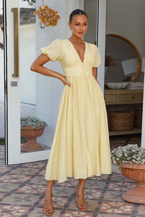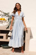 Made with a striped. lightweight seersucker-inspired fabric. this short-sleeve dress was meant to frolic through any field you stumble upon. High waist. creating a deep V-neckline and buttons as decoration. all atop an A-line maxi skirt with side seam pockets.