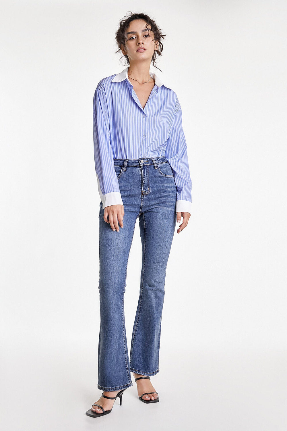 This shirt is such a stylish and versatile piece. Featuring a relaxed. contrasting pointed collar. buttons down the front. long sleeves with contrasting cuffs and a longer cut. For a French-chic look wear it tied up or open with white mini shorts and a crop top!
