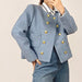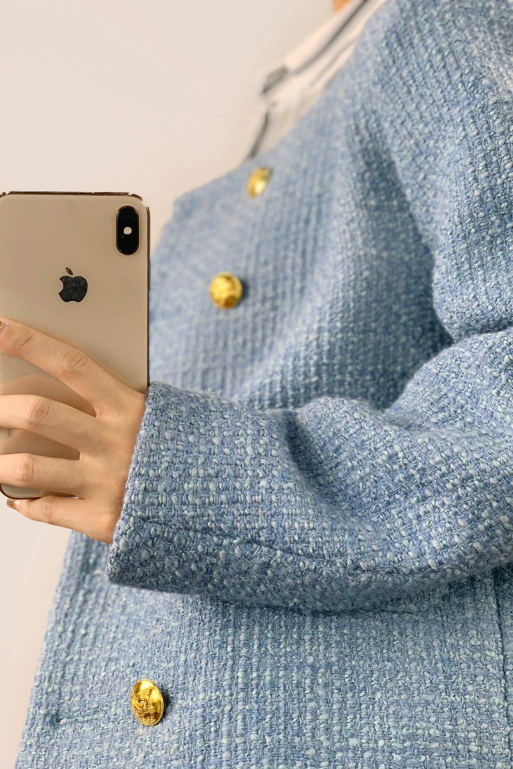 Pretty tweed that lends a timeless look. Featuring a fine tweed fabric with a double-breasted front(with embossed gold-tone buttons). a round neckline. long sleeves. and front patch pockets. A perfect outerwear for making power moves.