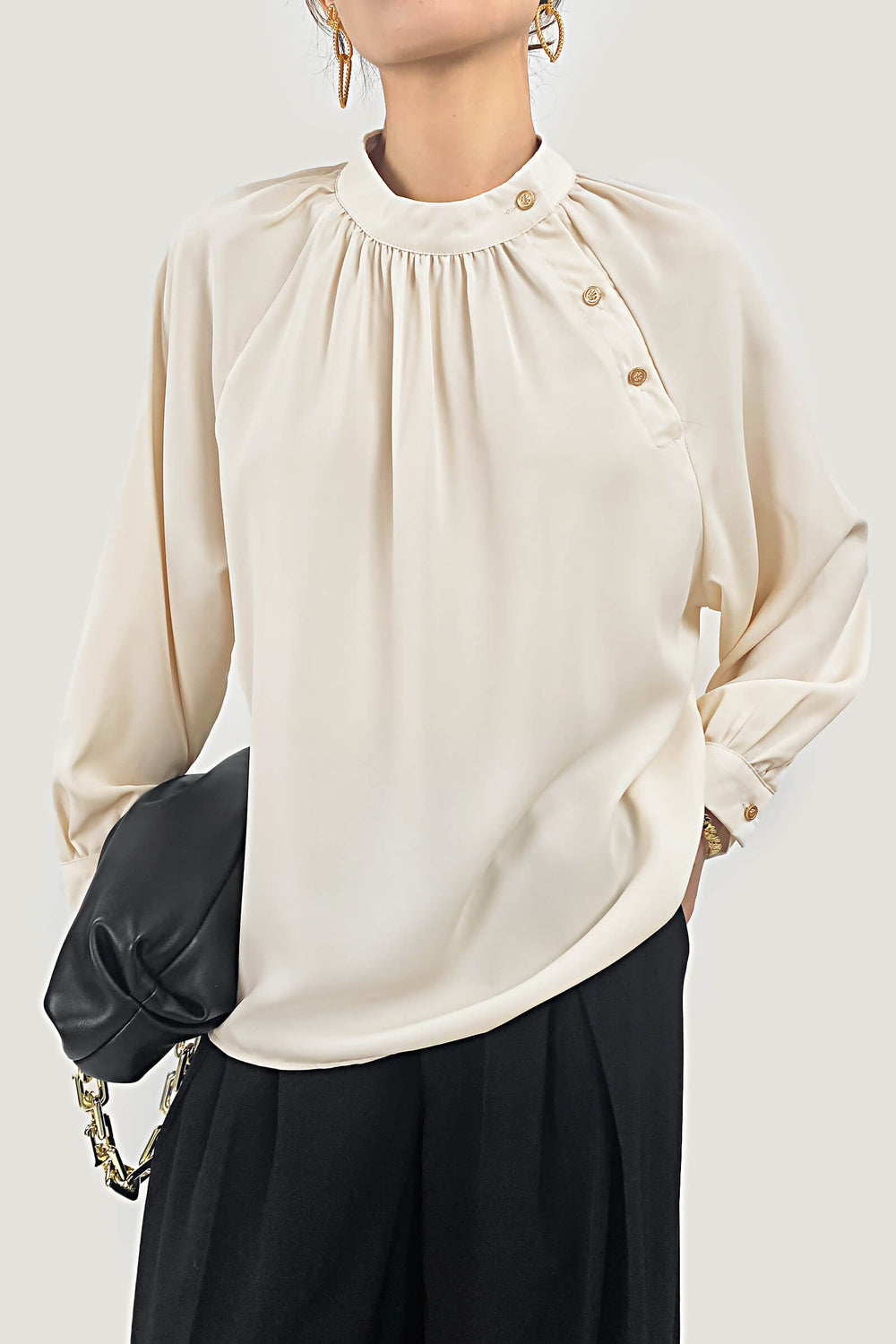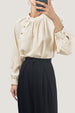 This Crew Neck Button Detail Pleated Blouse features a round neckline. long cuffed sleeves. a relaxed bodice and a trendy ruched detailing. We're crushing on the blouse which is cool and flowy and a good choice to pair with wide leg bottoms and clear heels for a chic look.