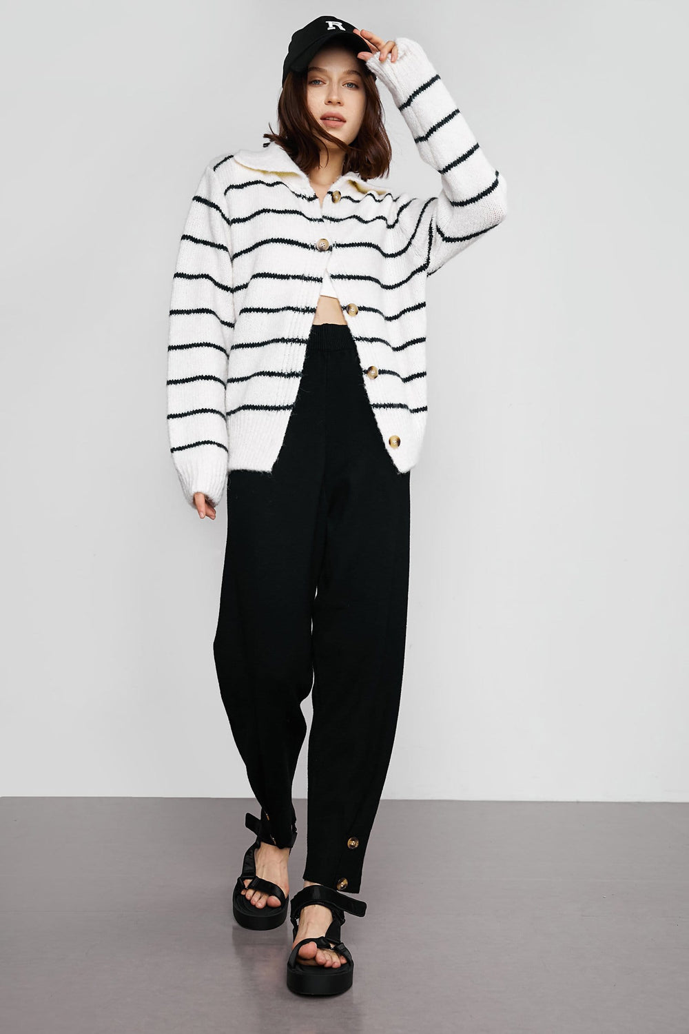 This soft cardigan features a lapel collar with a v-neckline. a flatter pinstripe pattern. long sleeves. and a single-breasted button placket. Made of polyester. crylic. and spandex.
