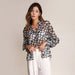 This shirt features long sleeves with a button closure on the cuffs. a pointed collar. a button placket. and leaf print throughout.