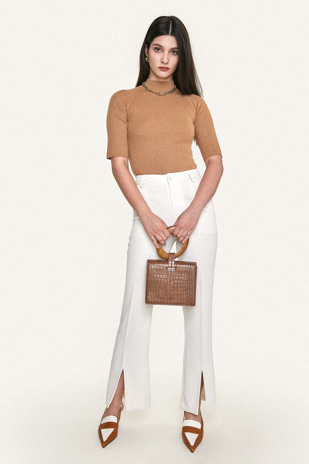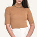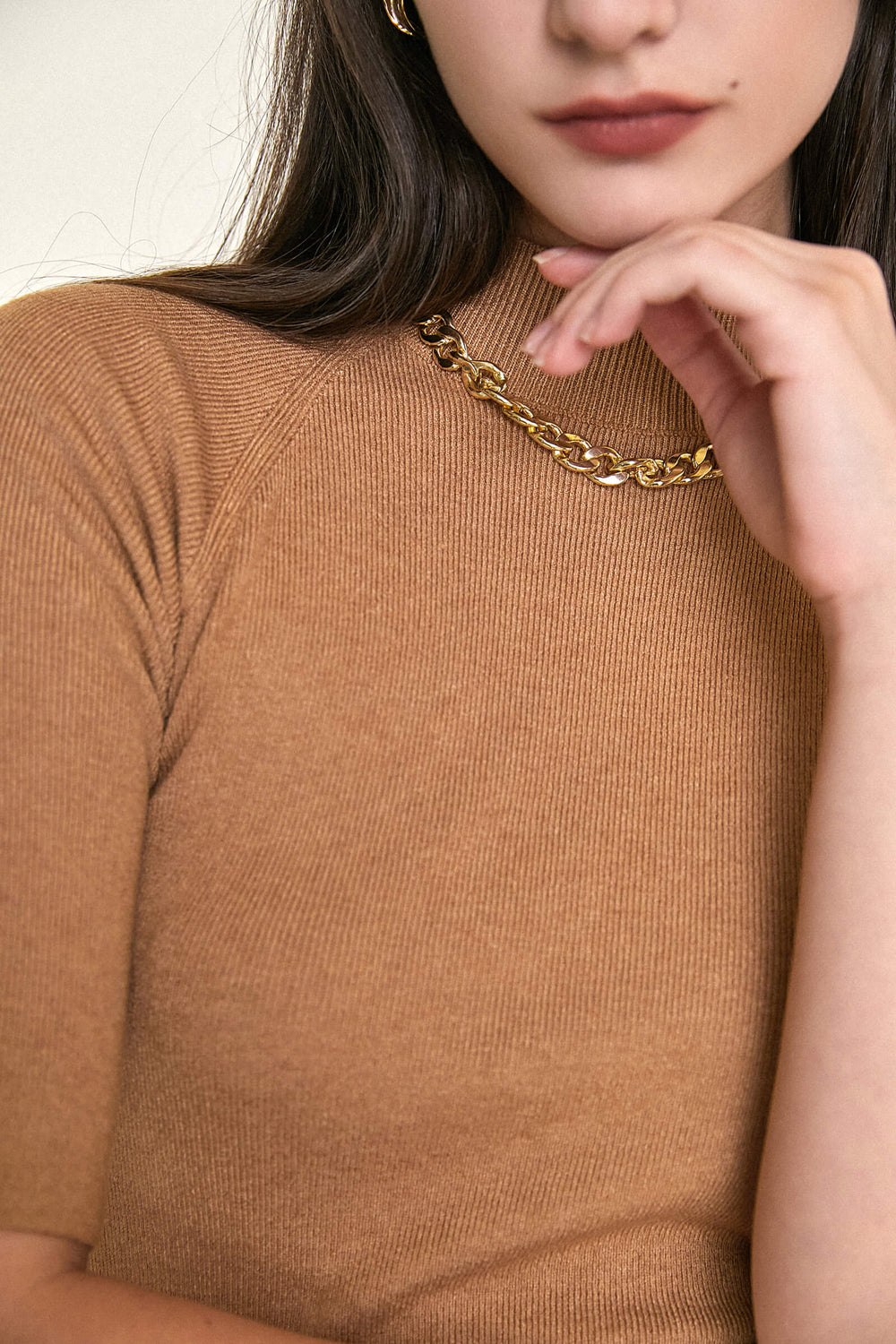 Stretchy ribbed knit shapes this sweater top that has a mock neckline. above the elbow raglan sleeves. and a figure-hugging fit. Pair this top with all your high-waisted bottoms for a retro-inspired 'fit!