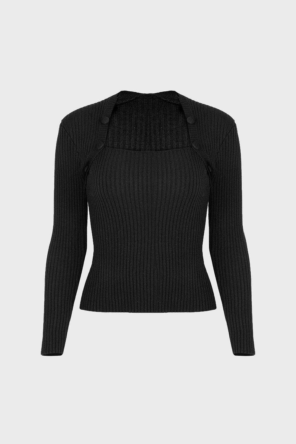 Look sleek in this tight sweater with a layered structure. Features a matching tank top and open. cropped fit.