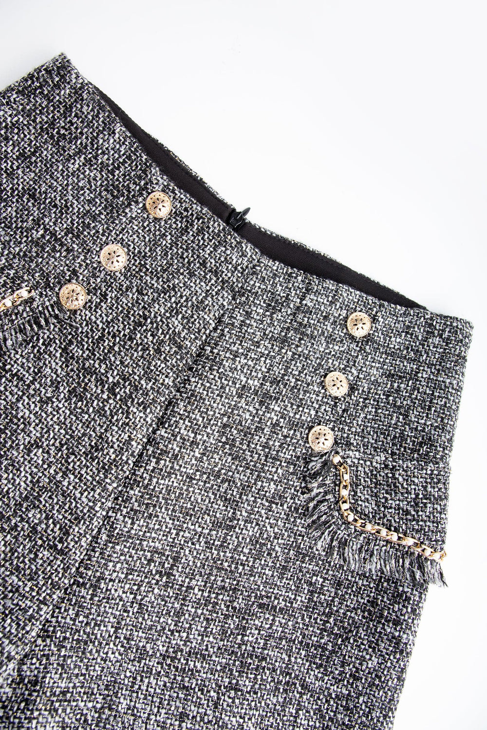 These shorts feature a high waistline. decorative gold-tone buttons. flap pockets with frayed trim. and an A-line silhouette.