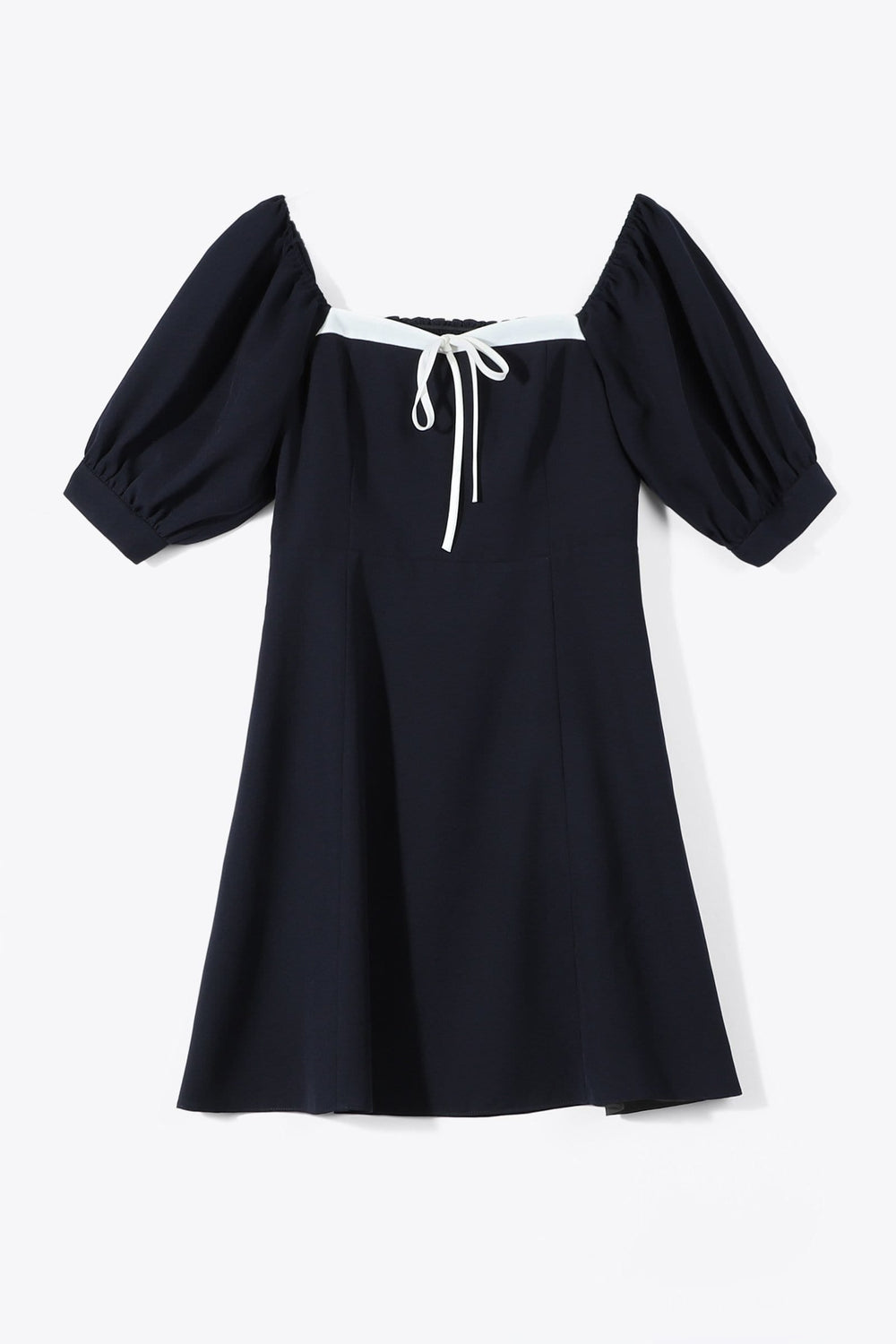 Have you ever seen a neckline this fun? This 60s mini dress comes in beige and navy. Draping fabric. puff sleeves. and an A-line design make for a perfect 'fun in the sun' dress!