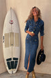 Denim is always an iconic choice. so elevate your seasonal wardrobe with the Edgy Instinct Wash Denim Long Sleeve Midi Dress! Sturdy cotton denim shapes this undeniably cool dress that has long sleeves with snap-button cuffs and a collared neckline. Bodice boasts two flap pockets with snap closures and a full snap button placket at front. Waist features belt loops and a removable sash belt. atop a column-style skirt that ends at a midi hem.