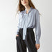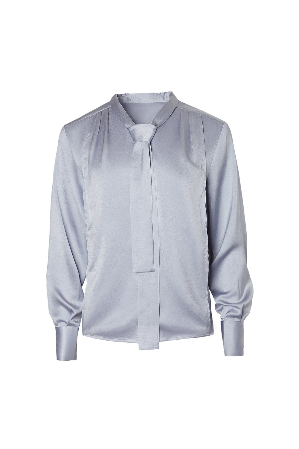 This shirt has a necktie. v-neckline. and long sleeves with wide cuff. Perfect for wearing with high waisted pants or to the office. Available in white and cornflower blue.