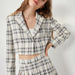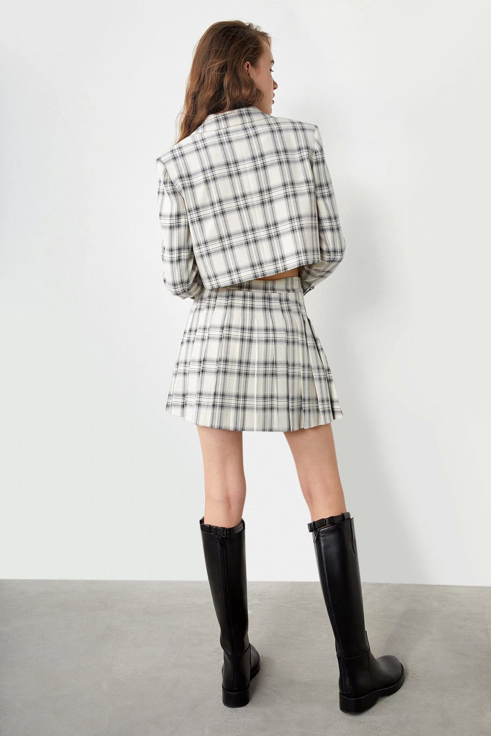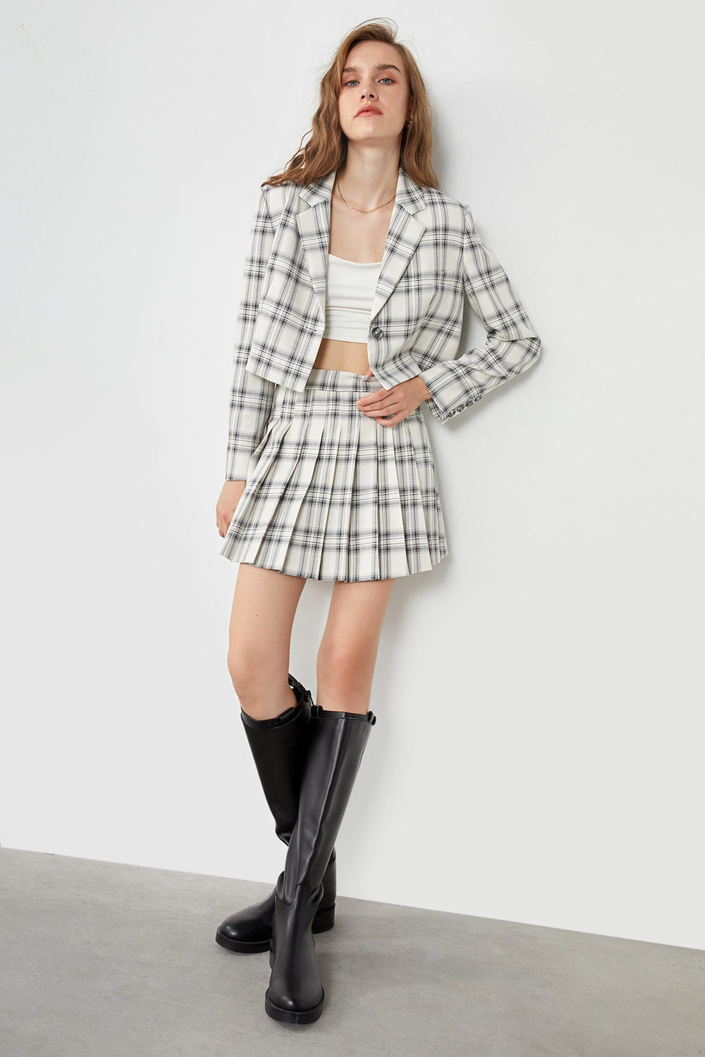 This petite women's blazer features a cropped fit. lapel neckline. and black crossbar plaid print. Pair with the Elliott White Pleated Skirt for the full outfit.