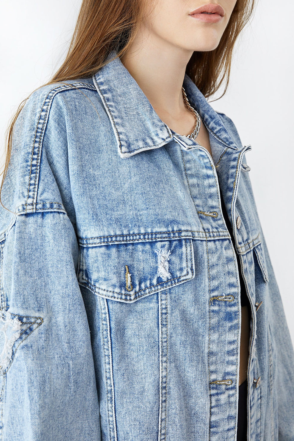 This oversize denim jacket features long sleeves with distressed pattern and button-up closure. Pair with one of our jeans for a casual and comfort co-ord!