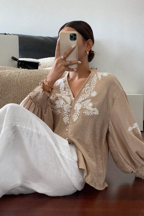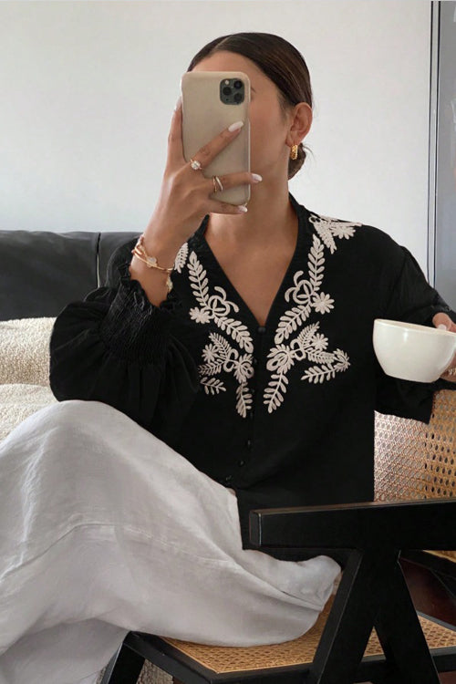 With classic style and an effortlessly sweet essence. you'll be the chicest in the streets in this Everyday Luck Floral Embroidered Cotton Top. Crafted with a floral embroidery. the blousy bodice features a V-neckline and a covered button placket. all framed by long blouson sleeves with dropped shoulders and elastic cuffs.