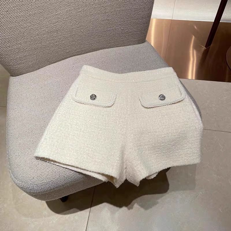 These tweed shorts are detailed with all-over metallic threads for added sheen. faux pearl buttons decor. a high waistline. and front zip and button closure. Perfect paired with a tweed jacket.