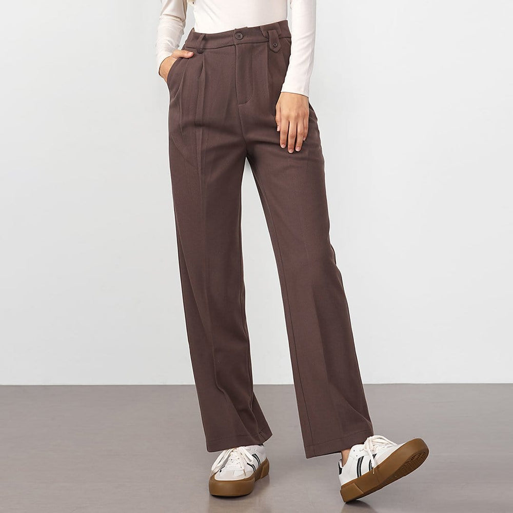 These saddle brown pants are made of smooth polyester. cotton. and spandex. Features a high waistline and a wide legged fit. Feel cool out on the town or lounging at home.