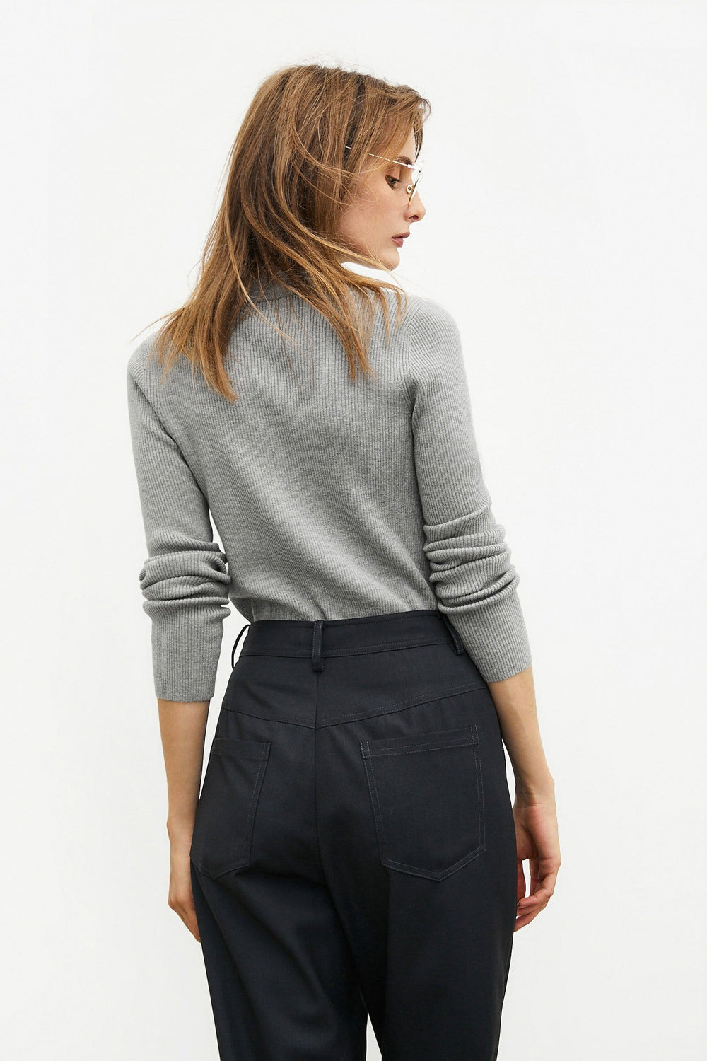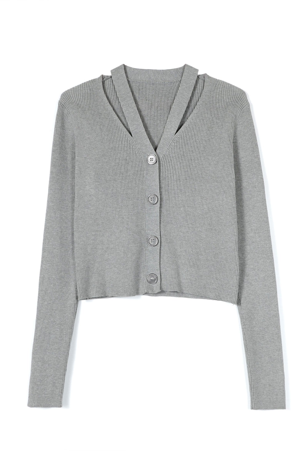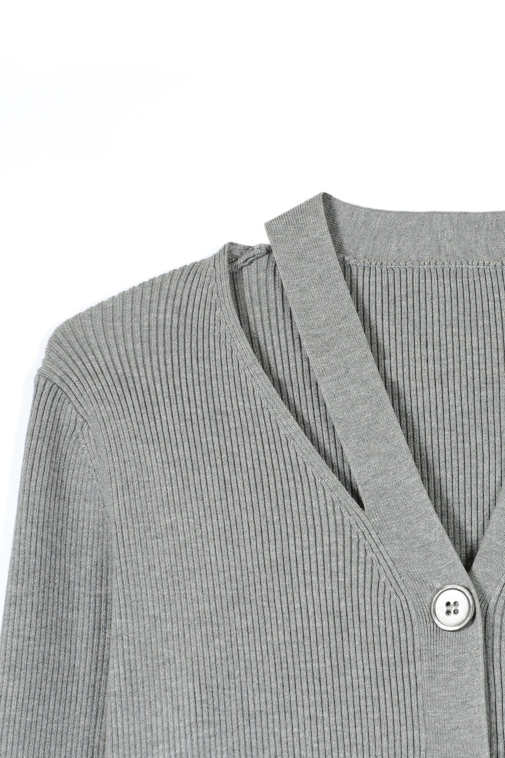 The coolest twist on a layering classic. A grey slim cardigan with a button-down front. long sleeves and cutout shoulder details. Pair with your favorite monochrome bottoms or jeans.