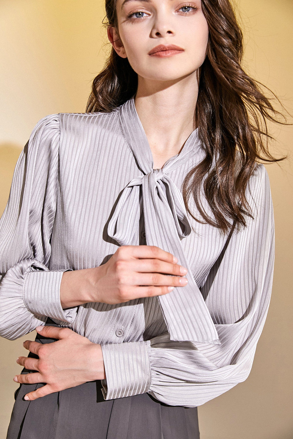 This gorgeous striped chiffon top has a chic tying neck. a button front. and long sleeves with fitted cuffs. Wear it with high waist jeans. chunky sneakers. and a mini handbag for a trendy day look.