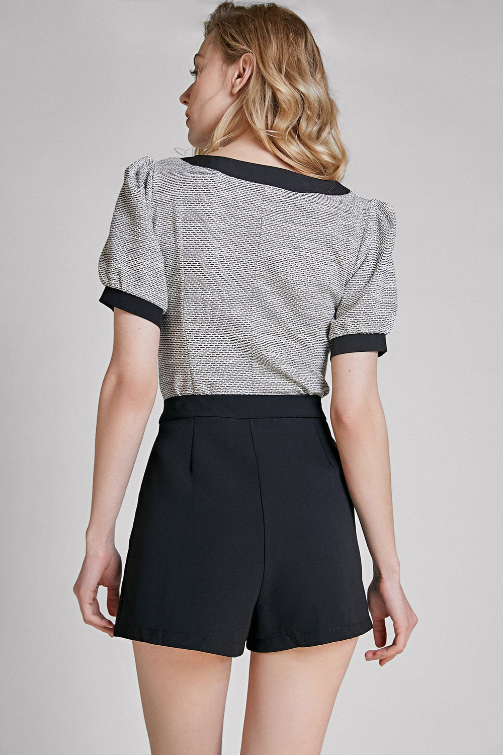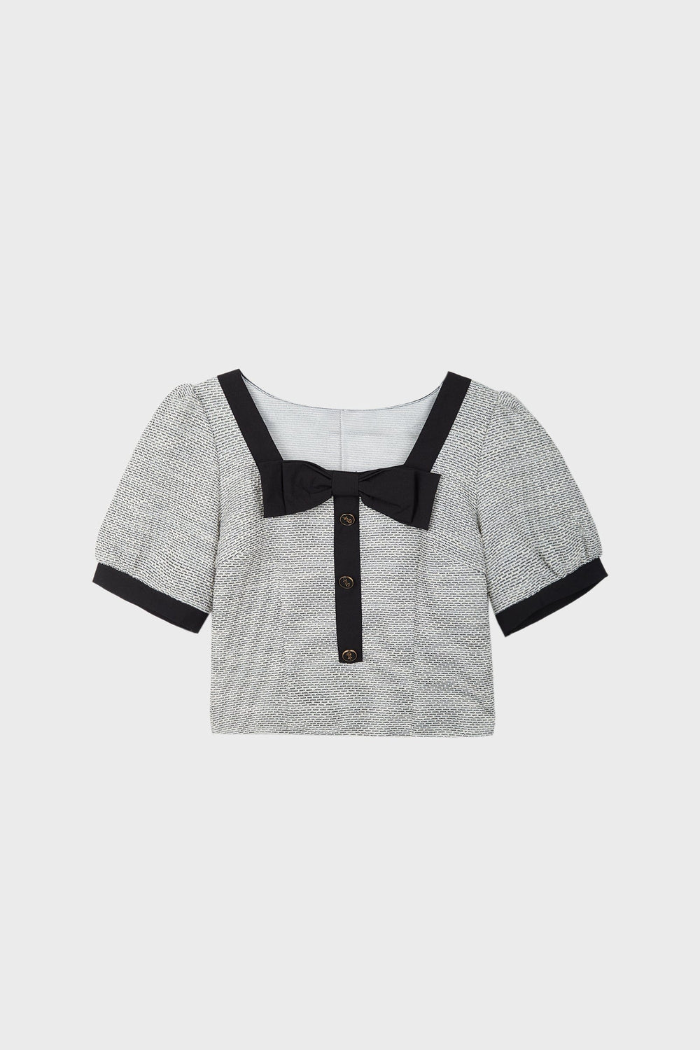 Add a touch of elegance to your wardrobe. This blouse features a square neckline accented with a bowknot. short puff sleeves. decorative buttons. contrasting trim. and a slightly cropped hem.
