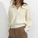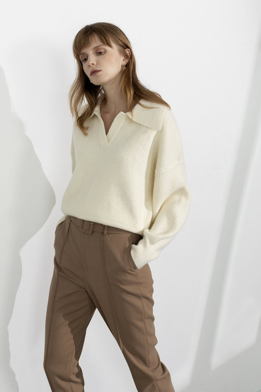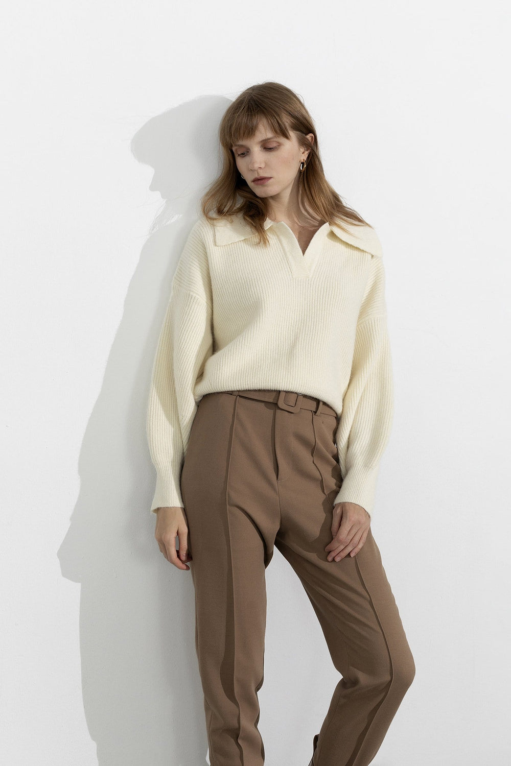Clean. chic. casual—the three c's for an effortless look. An ivory collared sweater featuring long sleeves and a cropped fit. Pair over minimalist trousers or jeans for a simple yet sophisticated look.