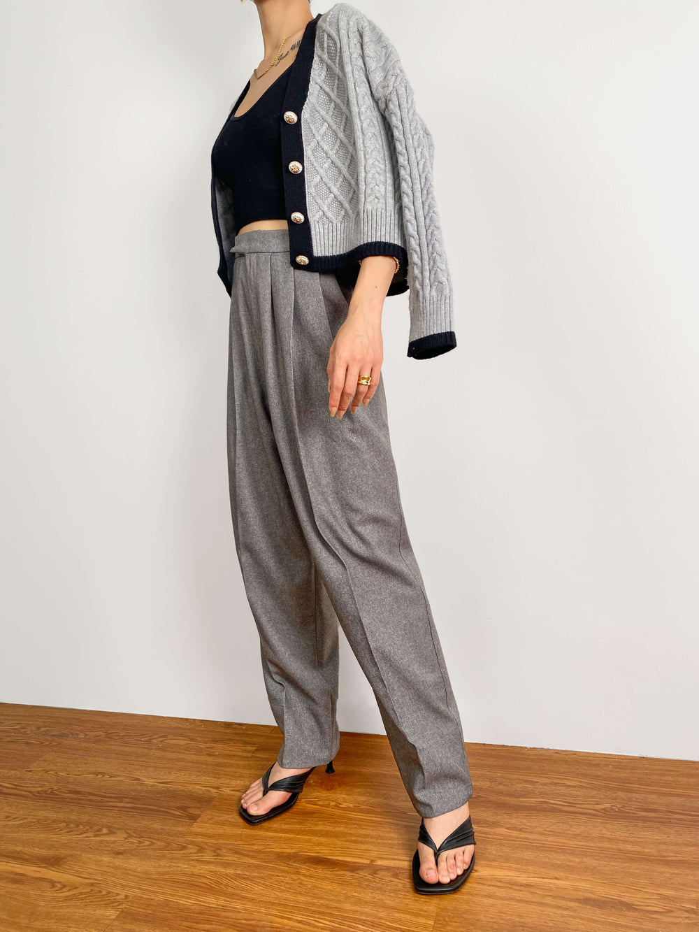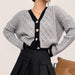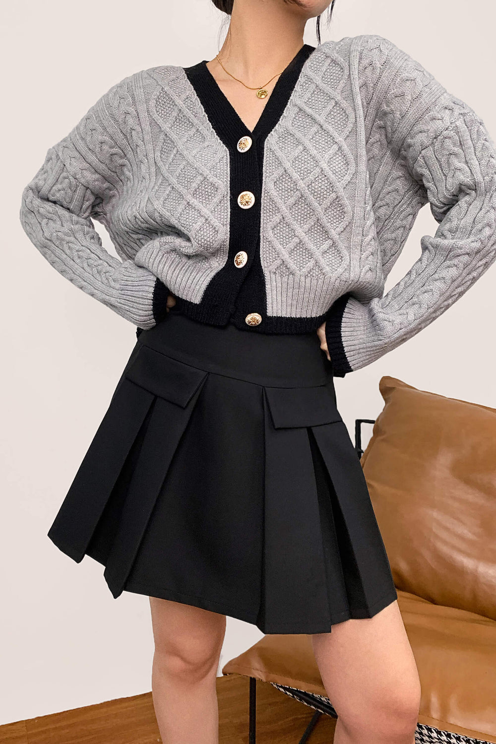 This button-up cardigan features a black trim. gold buttons. and a knitted rib pattern. Pair with pleated skirt or jeans for an academy look. Made of acrylic. rayon. and nylon. Available in white. black and grey.