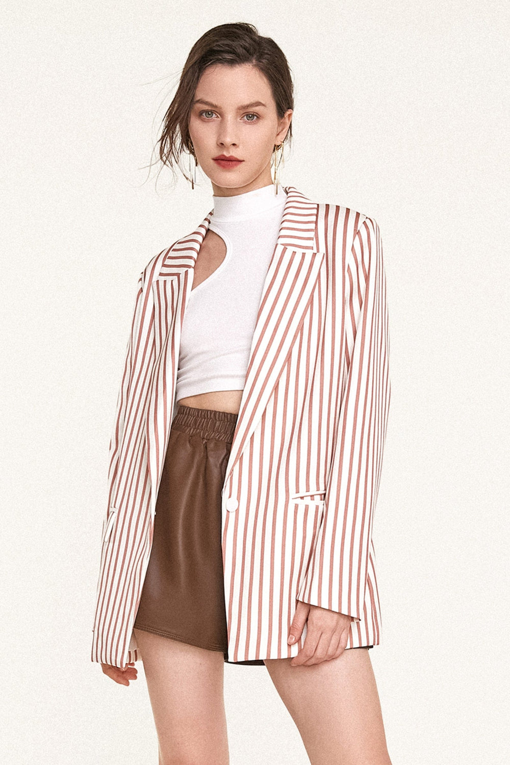 Add a little edge to your wardrobe with this blazer. Featuring vertical stripes. a single button closure. peak lapels. front flap pockets. and long sleeves. Pair with jeans and heels for for an unreal everyday look.