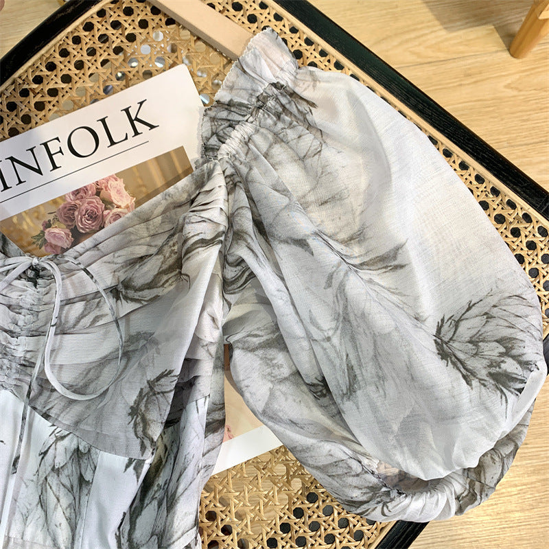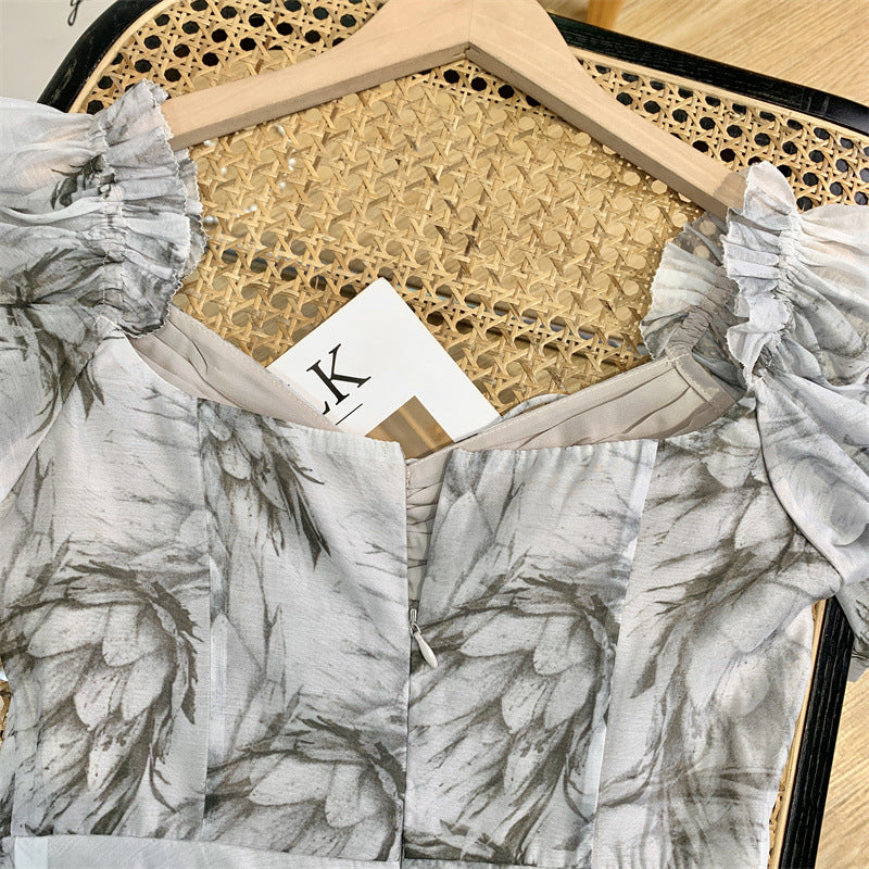 Ink print dress. Cut with a square neck halter neck and fitted waist. it's a flowy dress full of fairy.
