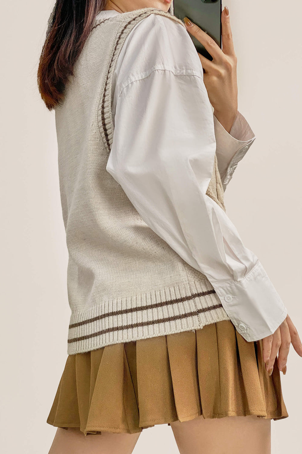 An ideal transitional or layering piece. This vest features a V-neck. a sleeveless design. cable knit details. contrasting striped trim and ribbing at the neckline. armholes. and hem.