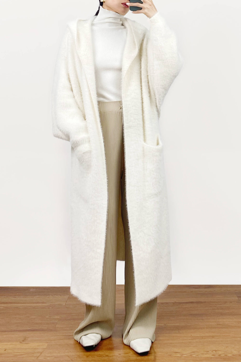 Amp up your A/W wardrobe with this chic cardigan. This perfectly cozy and cute cardigan features a soft-touch faux fur fabric with long sleeves. an oversized hood. an open-front design. and a long silhouette.
