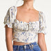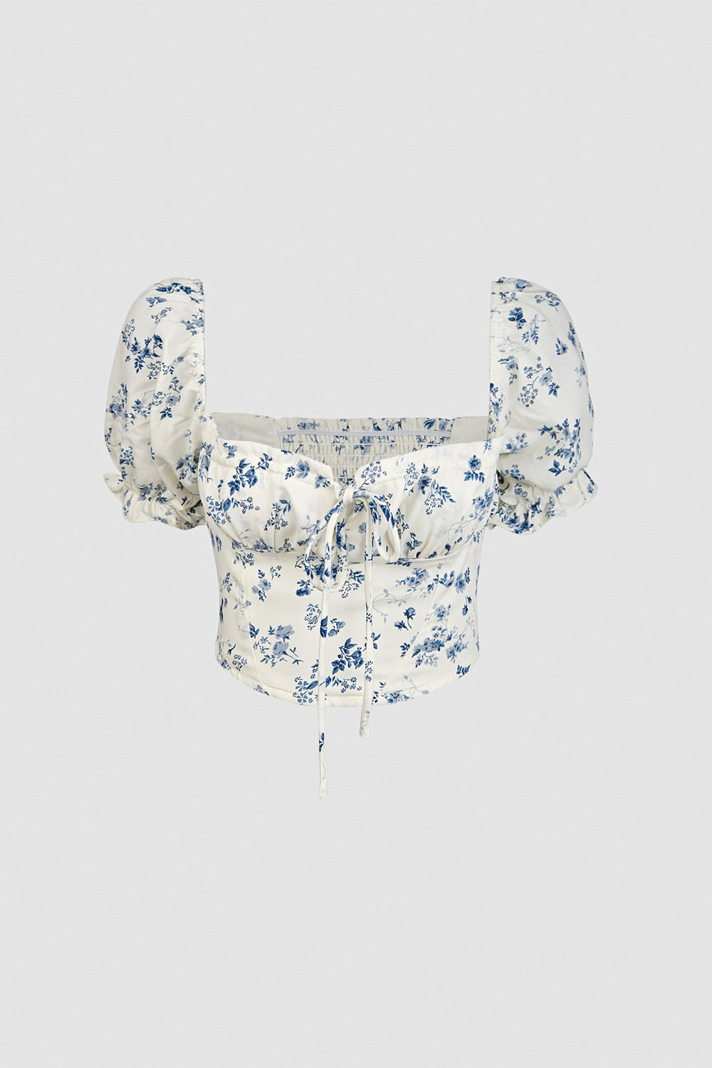 Step into the new season in this chic top. Featuring a contrasting floral print with a square neckline. self-tie detail. puff sleeves with elastic. ruffle cuffs. and a cropped length. Style with high-waisted jeans and heels to have all eyes on you.