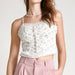Strike an alluring look in this stunning cami top. Featuring a floral lace overlay with a sweetheart neckline. decorative buttons at front. adjustable straps. and ruffle trim. team this with some matching hue bottoms and barely-there heels for a look we're loving.