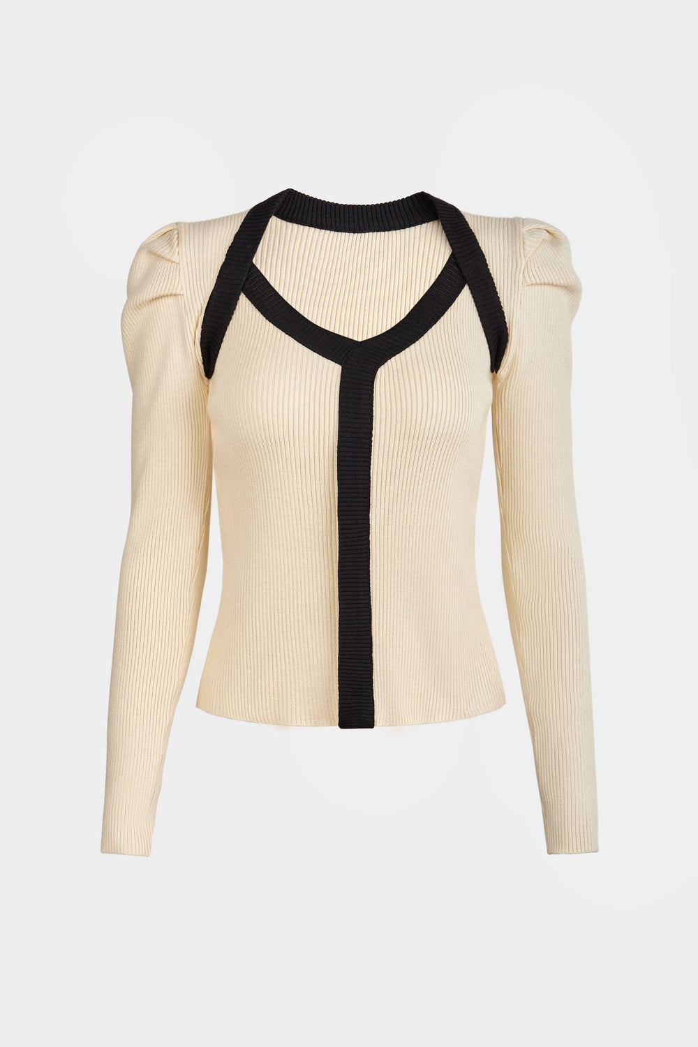 Stretchy ribbed knit shapes this sweater that has a V-neckline. contrast trim. long sleeves. and a fitted silhouette. Perfect for pairing with high-rise jeans.