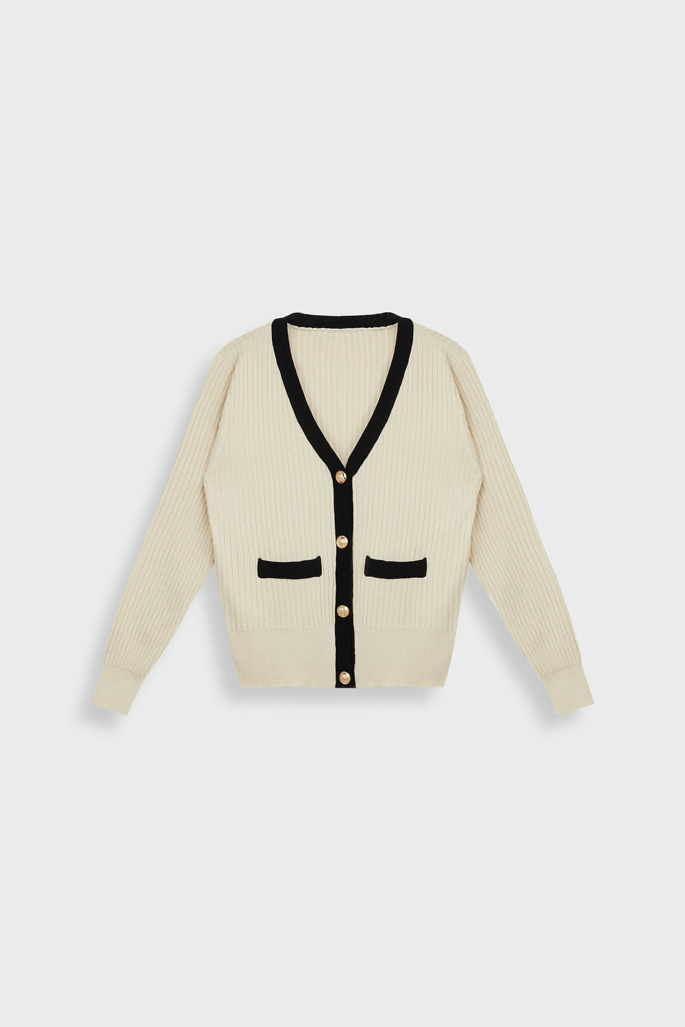 This soft cardigan features a v-neckline. long sleeves. a single-breasted button placket. double front pockets. and a contrast trim. Made of cotton and polyester. Available in black and white.