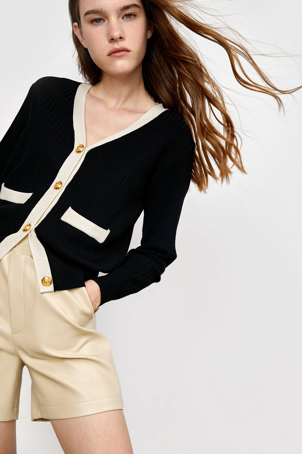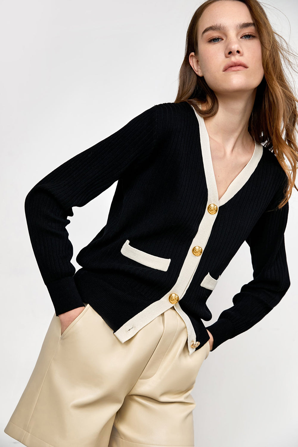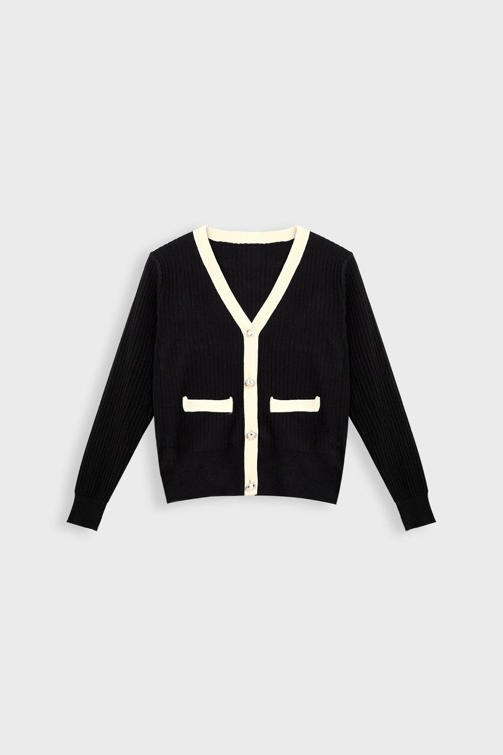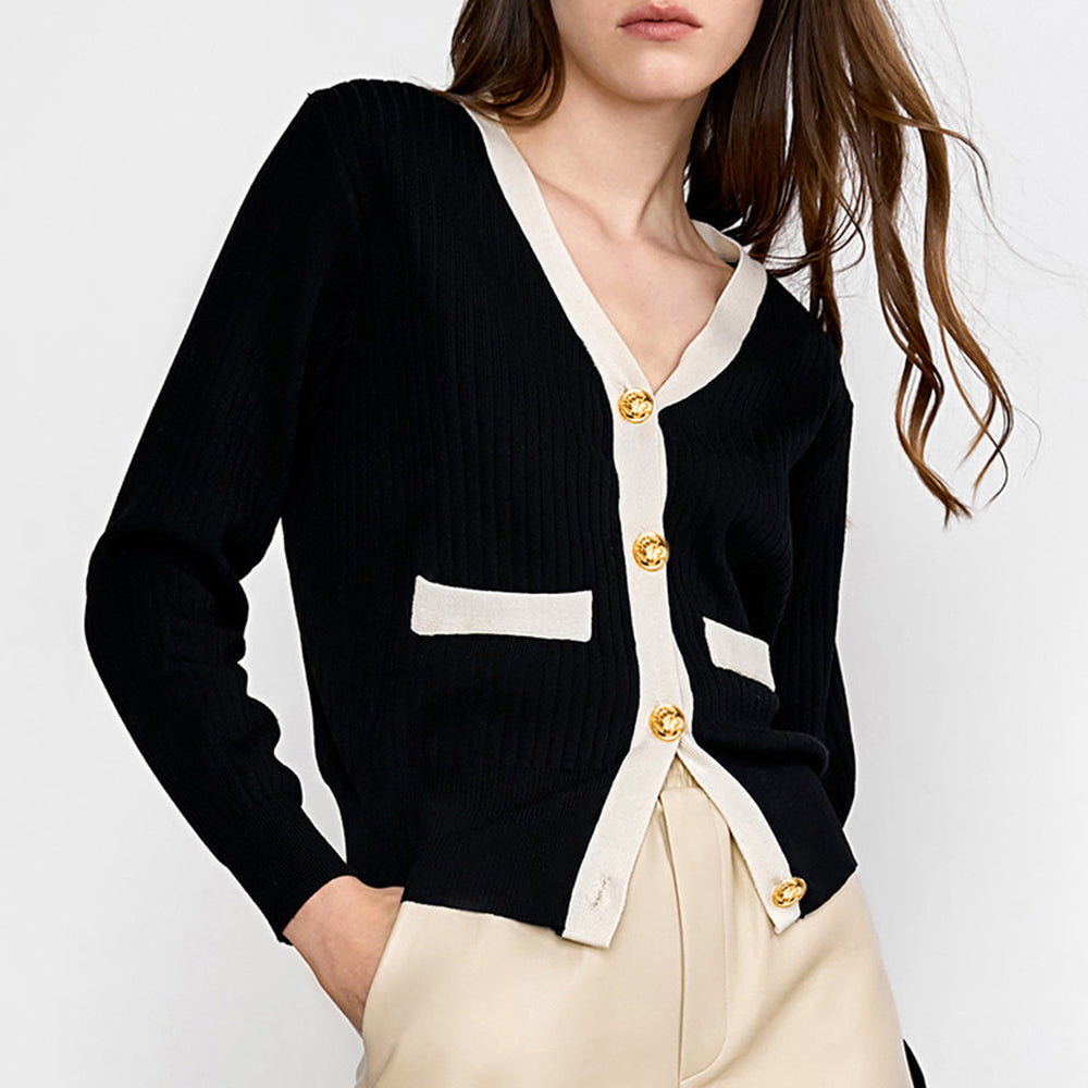 This soft cardigan features a v-neckline. long sleeves. a single-breasted button placket. double front pockets. and a contrast trim. Made of cotton and polyester. Available in black and white.