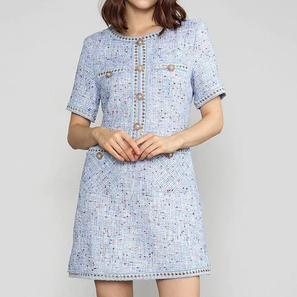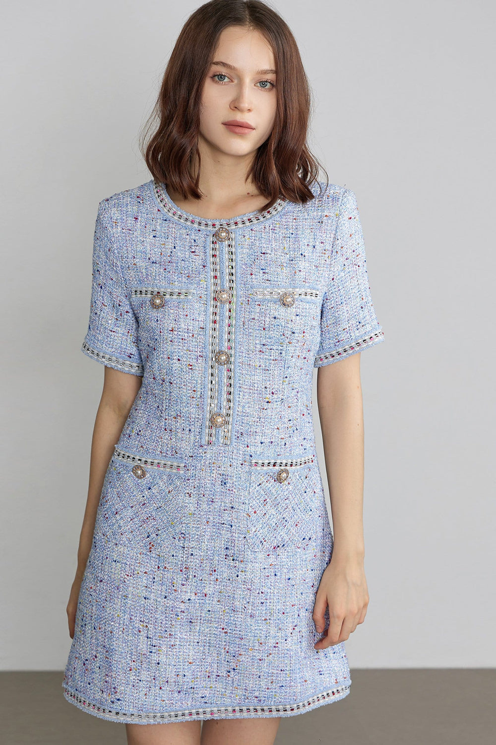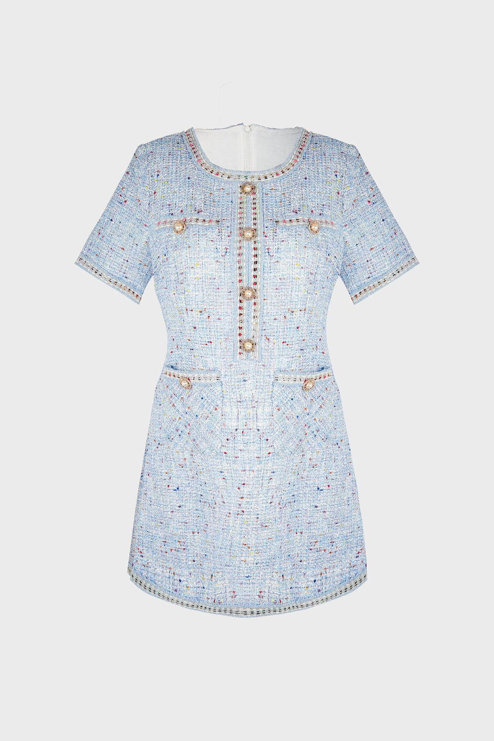 This delicate mini dress features capped sleeves and dainty gold buttons. Available in both pink and blue.