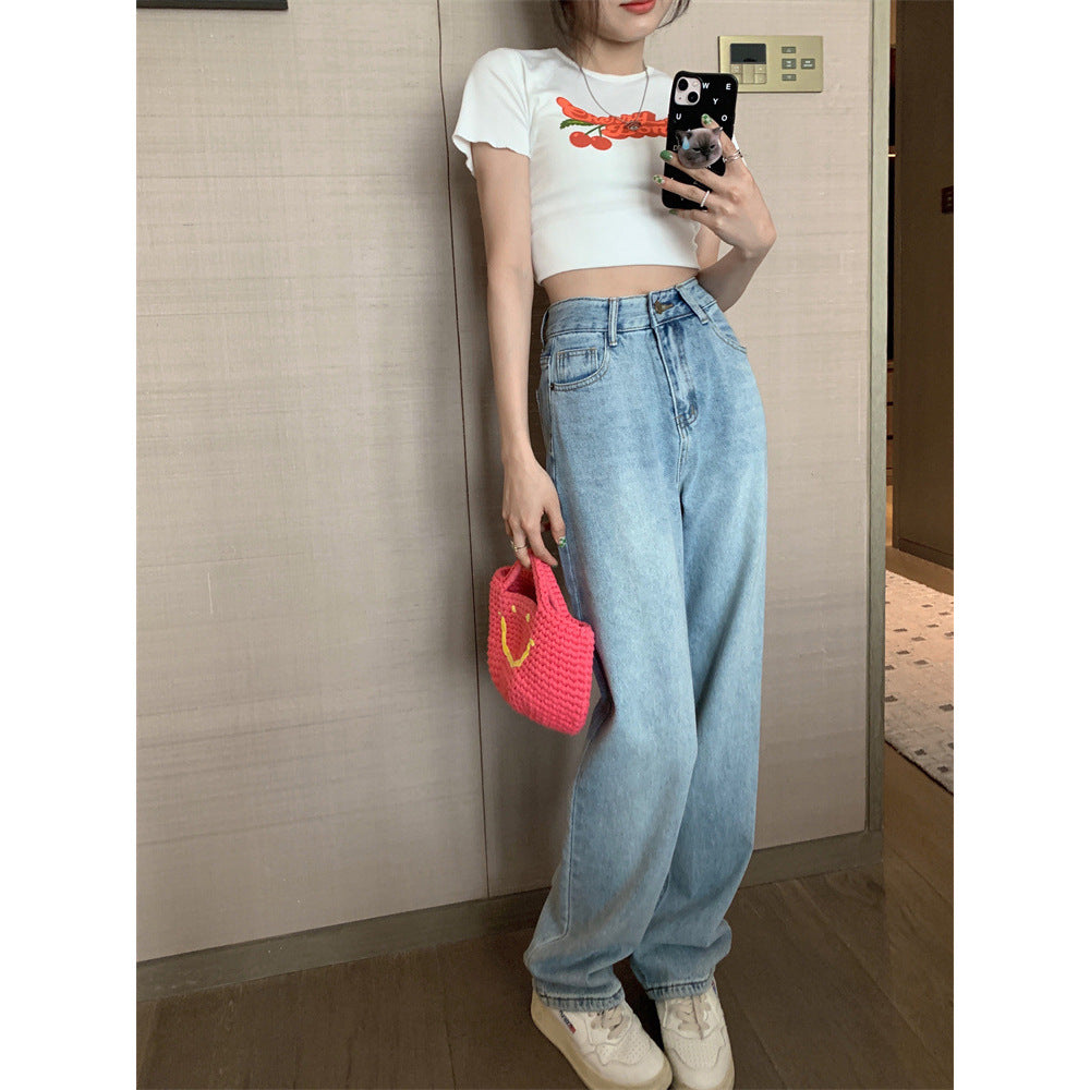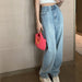 5-pocket jeans in washed stretch denim with distressed details. High waist. zip fly with button. and straight legs for the perfect 90s vibe. They are the ultimate wardrobe staple for effortless and stylish looks.