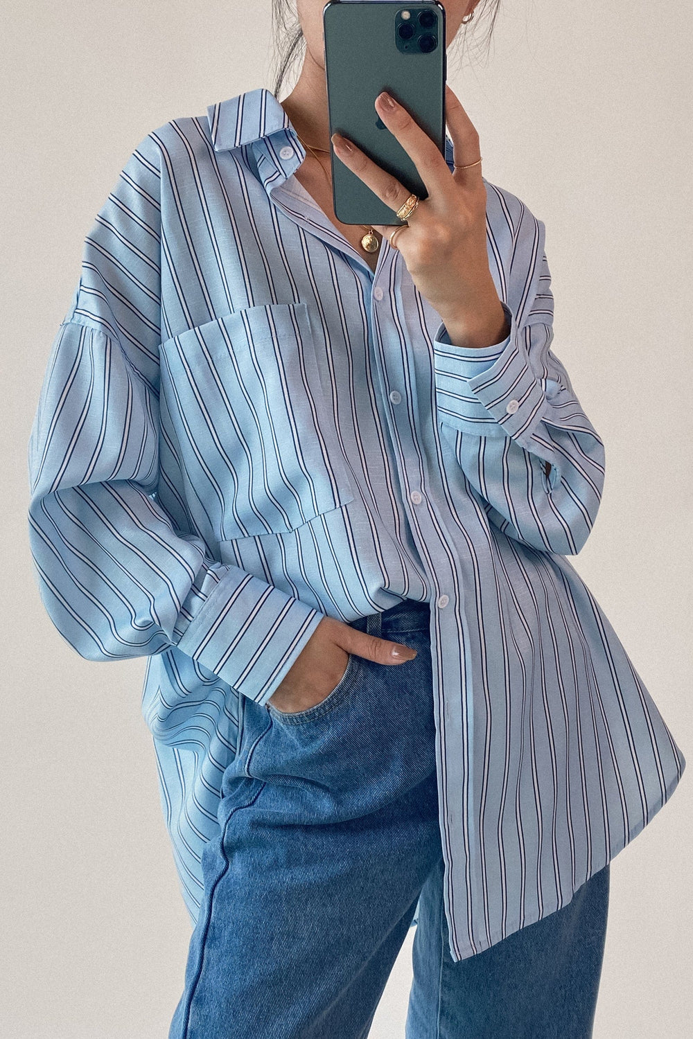 This piece is all about keeping an easy. laidback profile with its pinstripe design and oversized silhouette. Featuring a classic collar. a button-up front. front patch pocket. and long sleeves with drop shoulders. Combine it with a bralette and mom jeans for a chilled vibe.