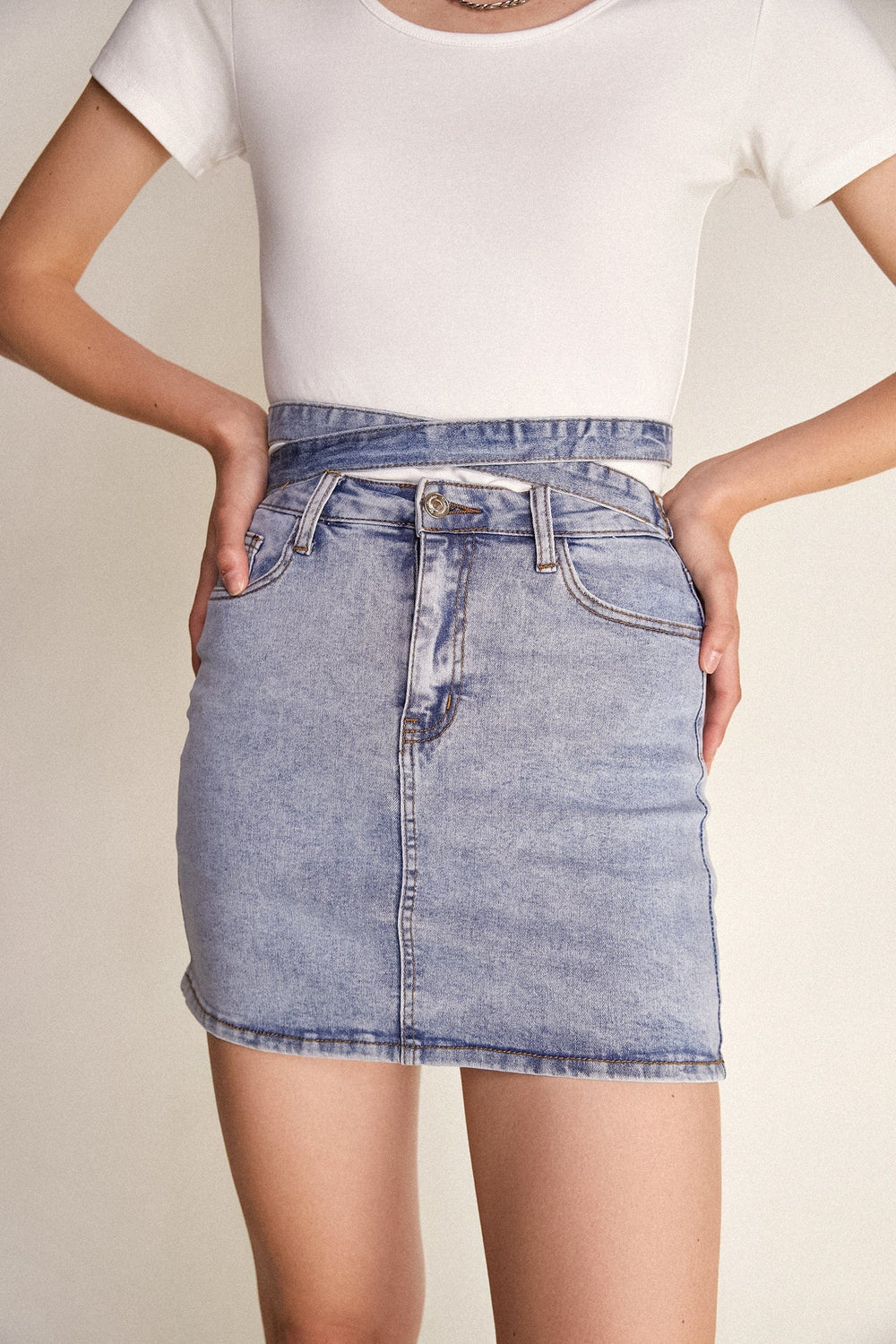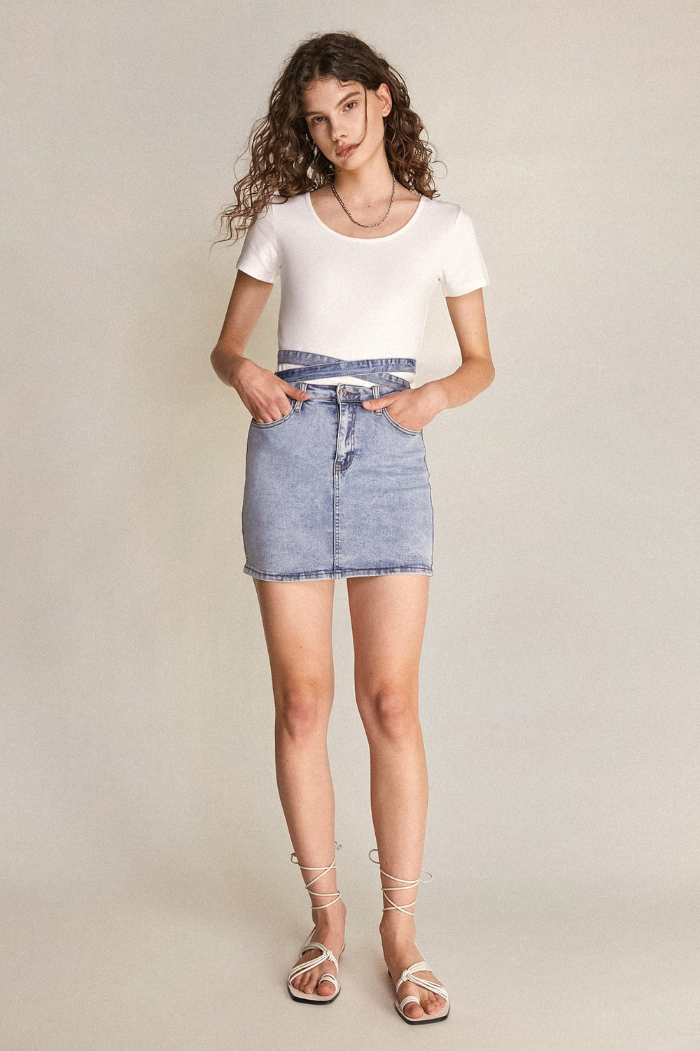 This denim skirt comes in a light wash denim and features tie strap detailing. 5-pocket cut and a figure-skimming fit. Wear it with the tie secured at the front on the side. or at the back in a bow - either way the effect will be stunning!
