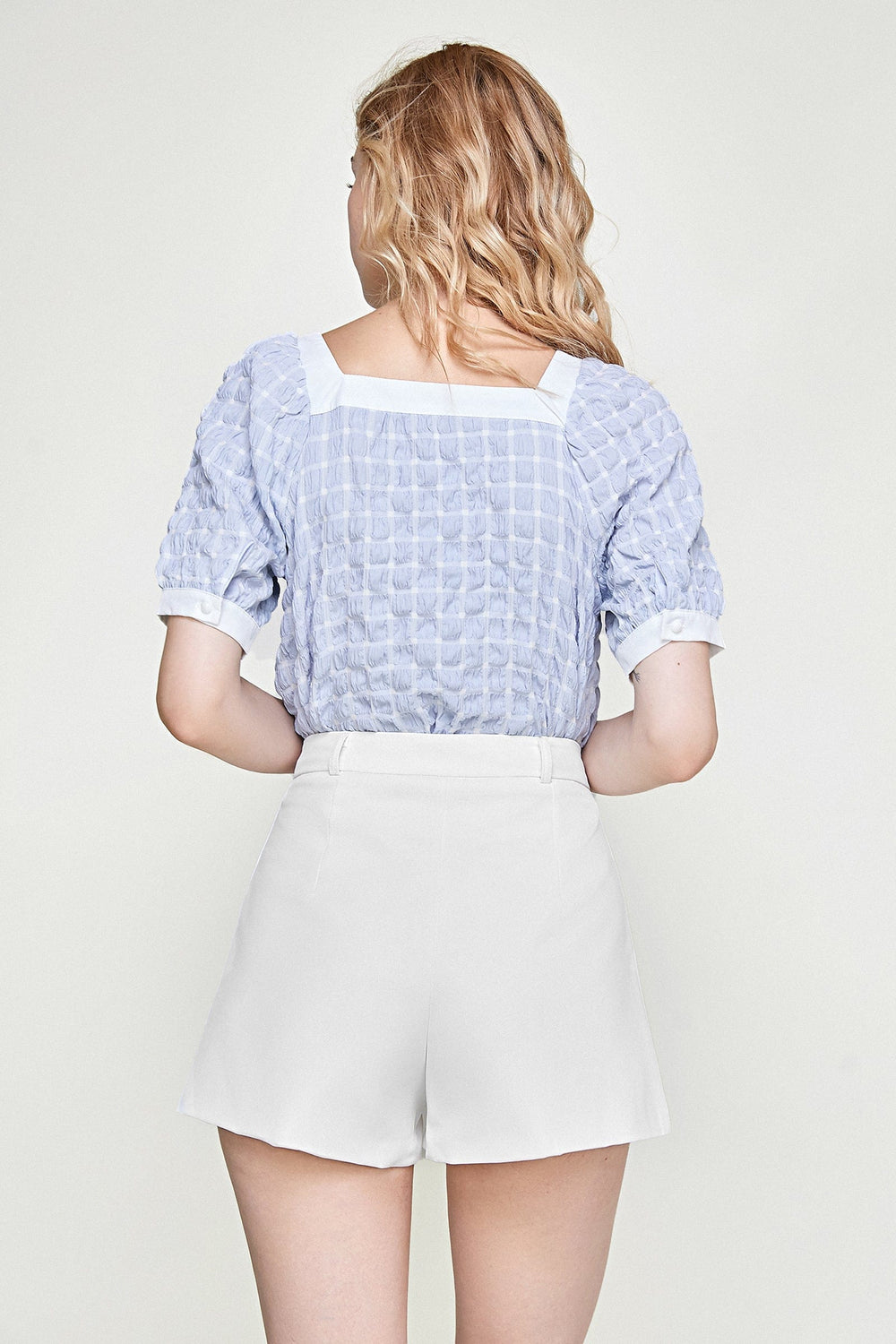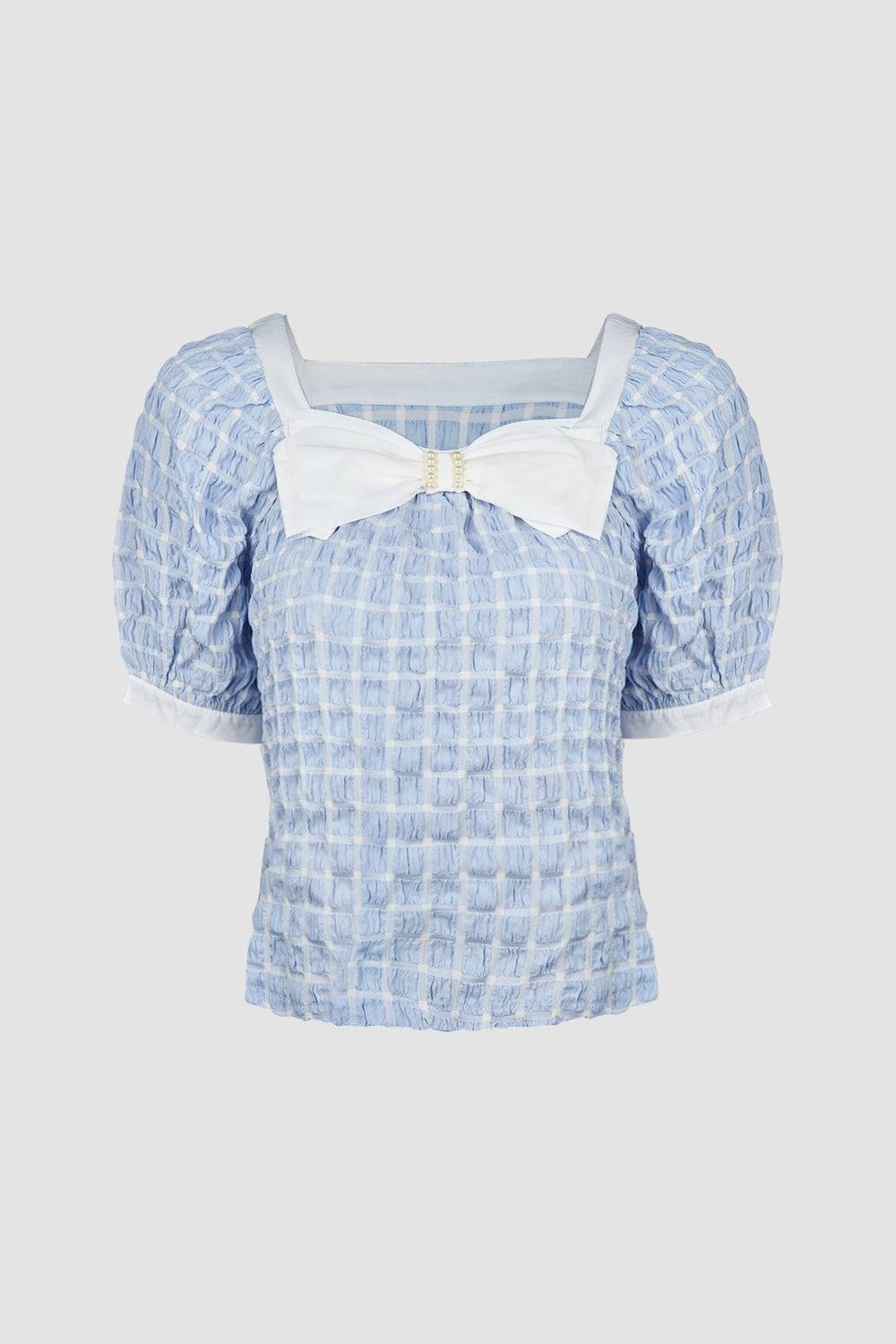 Embrace the warmer weather by looking trendy in this piece. Featuring a textured fabric with a square neckline. short puffy sleeves. bow embellishment. and contrasting trim. Wear it with skirts or wide leg pants and simple accessories for the perfect combo.