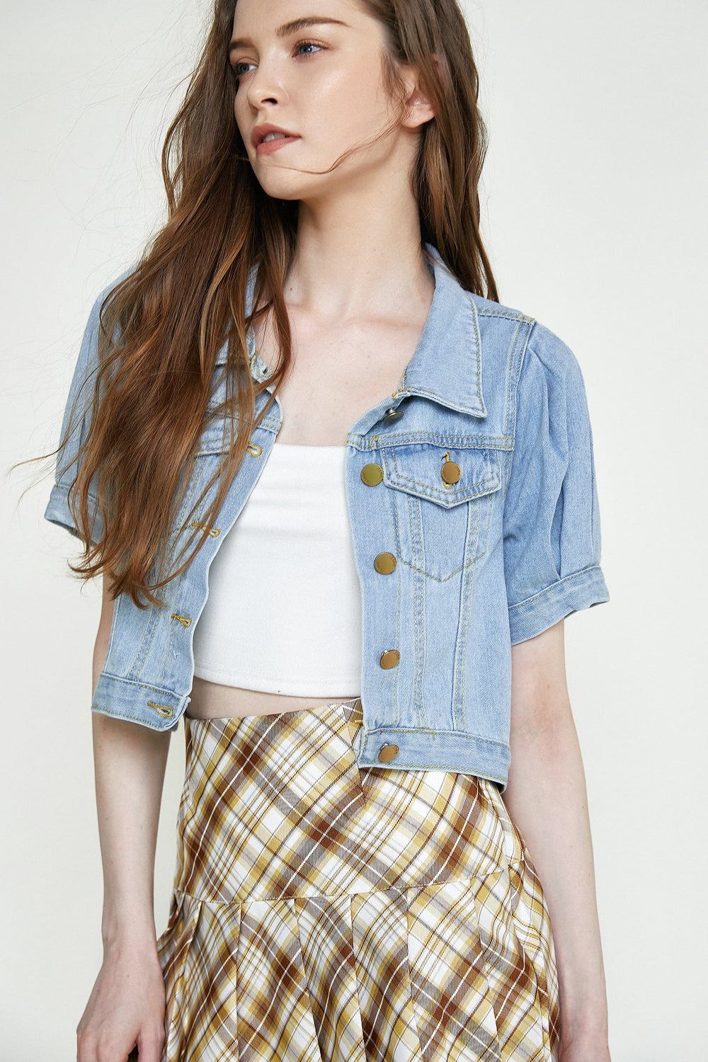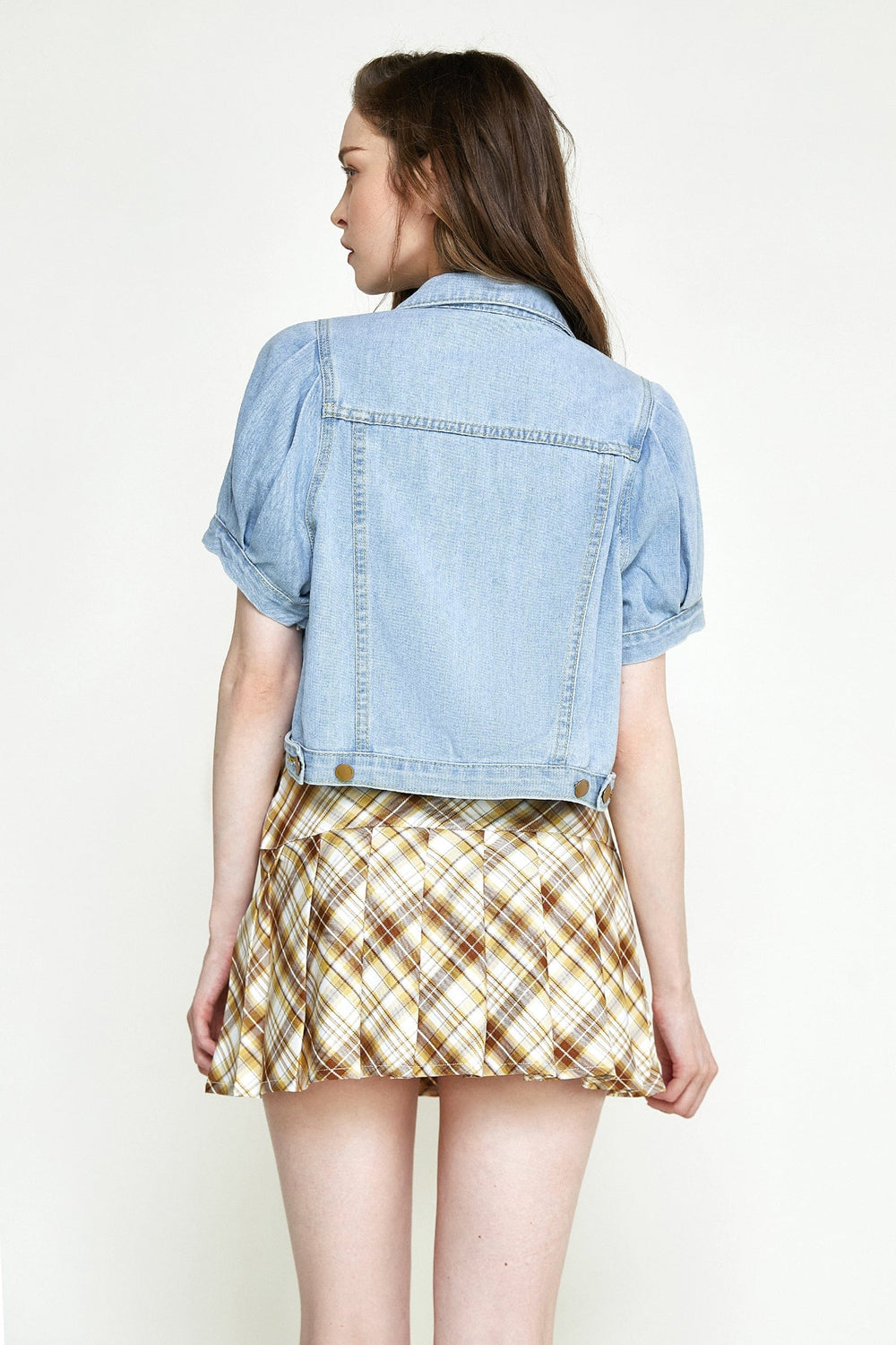This denim jacket will be the talk of the town with its trendsetting style. Lightweight denim shapes this chic jean jacket with a collared neckline. puffy sleeves. front flap pockets. a full button placket. and a cropped length. Seamed detail travels diagonally along the bodice. adding an edgy twist to the classic silhouette.
