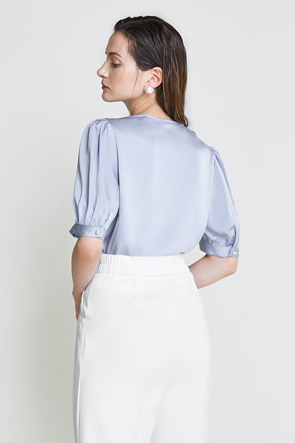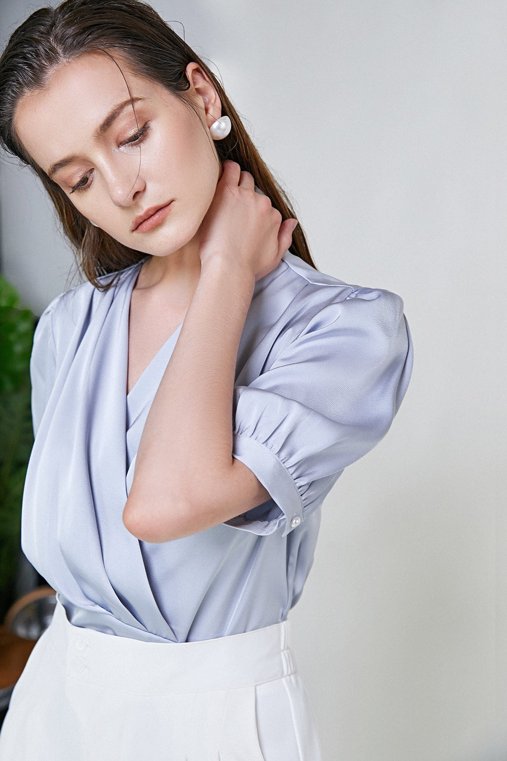 Achieve the perfect outfit with this top. Featuring a surplice neckline. blousy bodice. and a wide. banded hem. The short puff sleeves have trendy ruching accents. Pair with your fave bottoms and heels to complete the look.