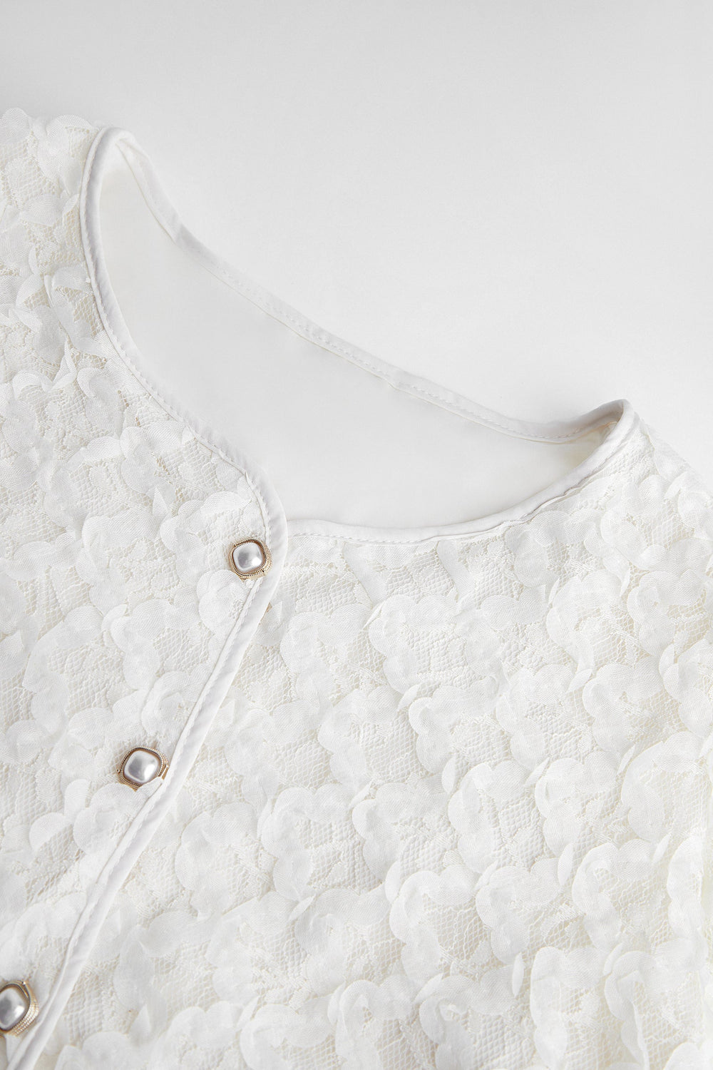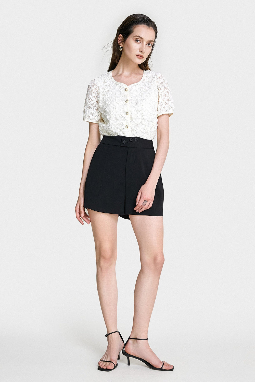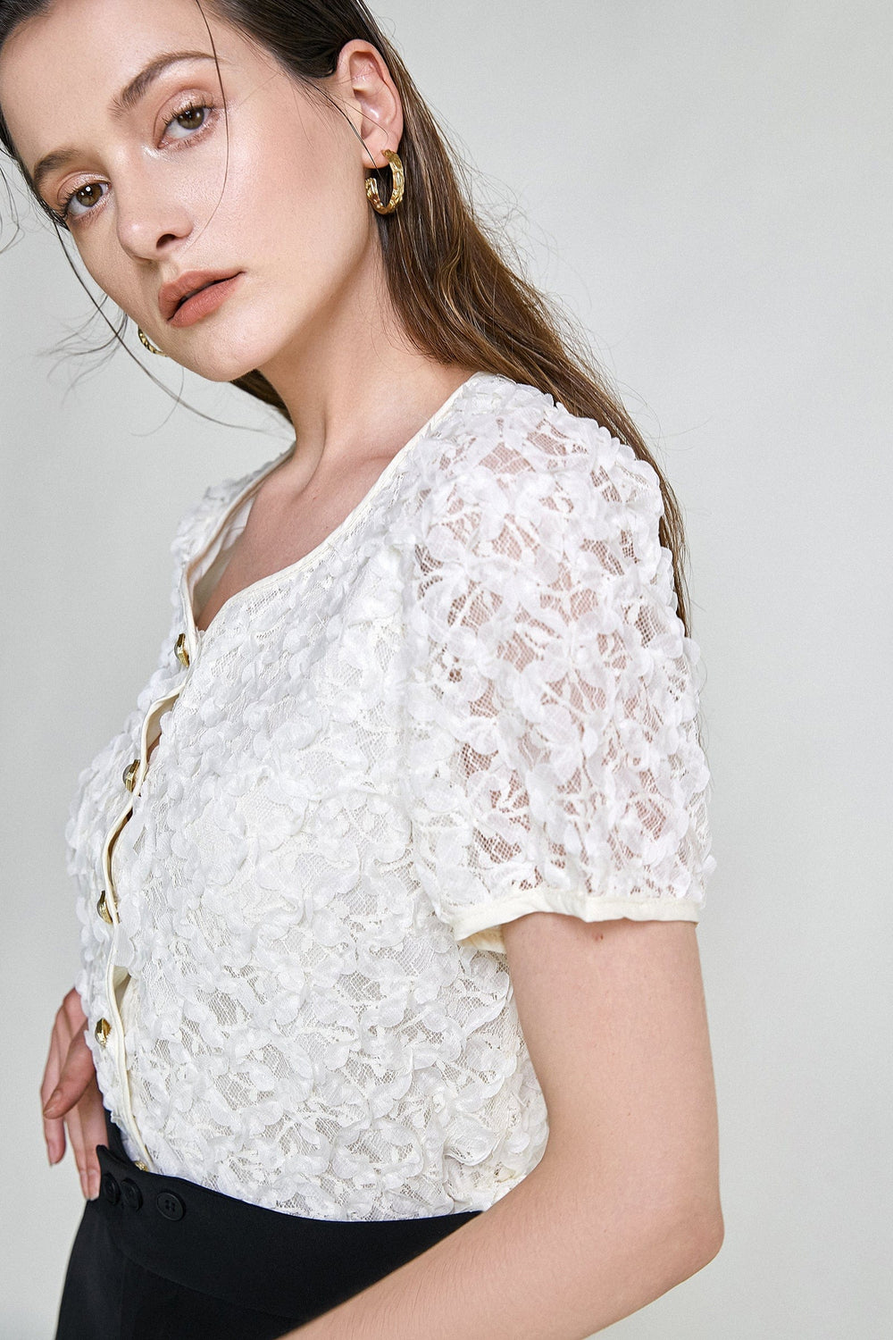 Give your look a seriously chic update with this top. Featuring a textured floral design with a button front and short sleeves. style with high waisted jeans and mules for a catch up with girls.