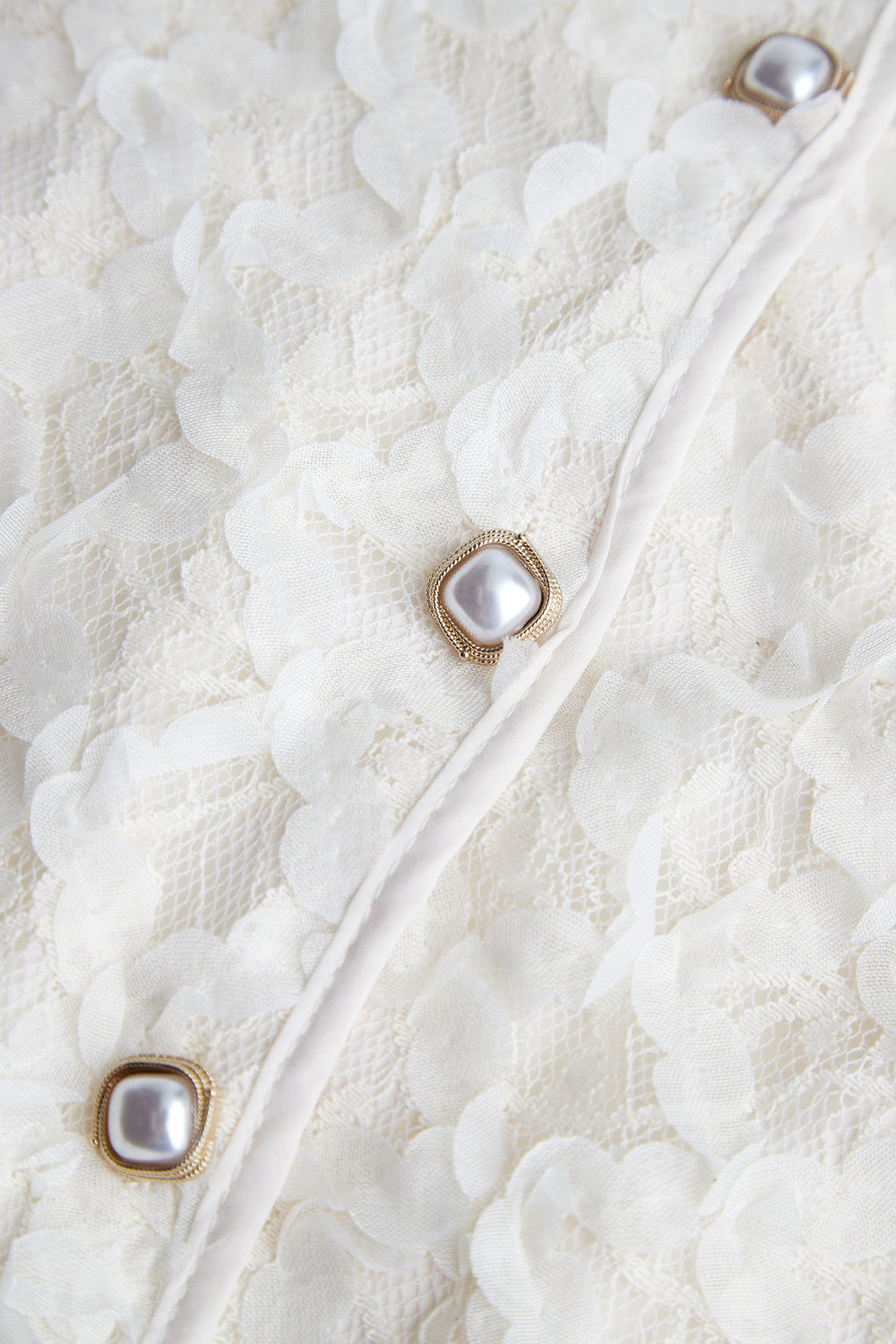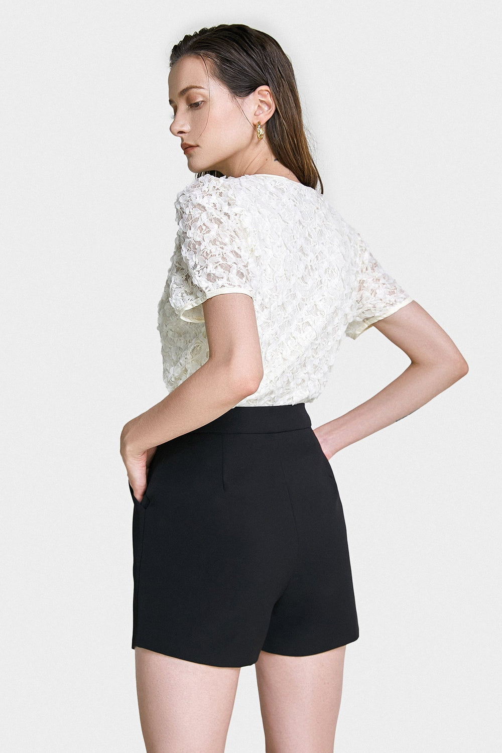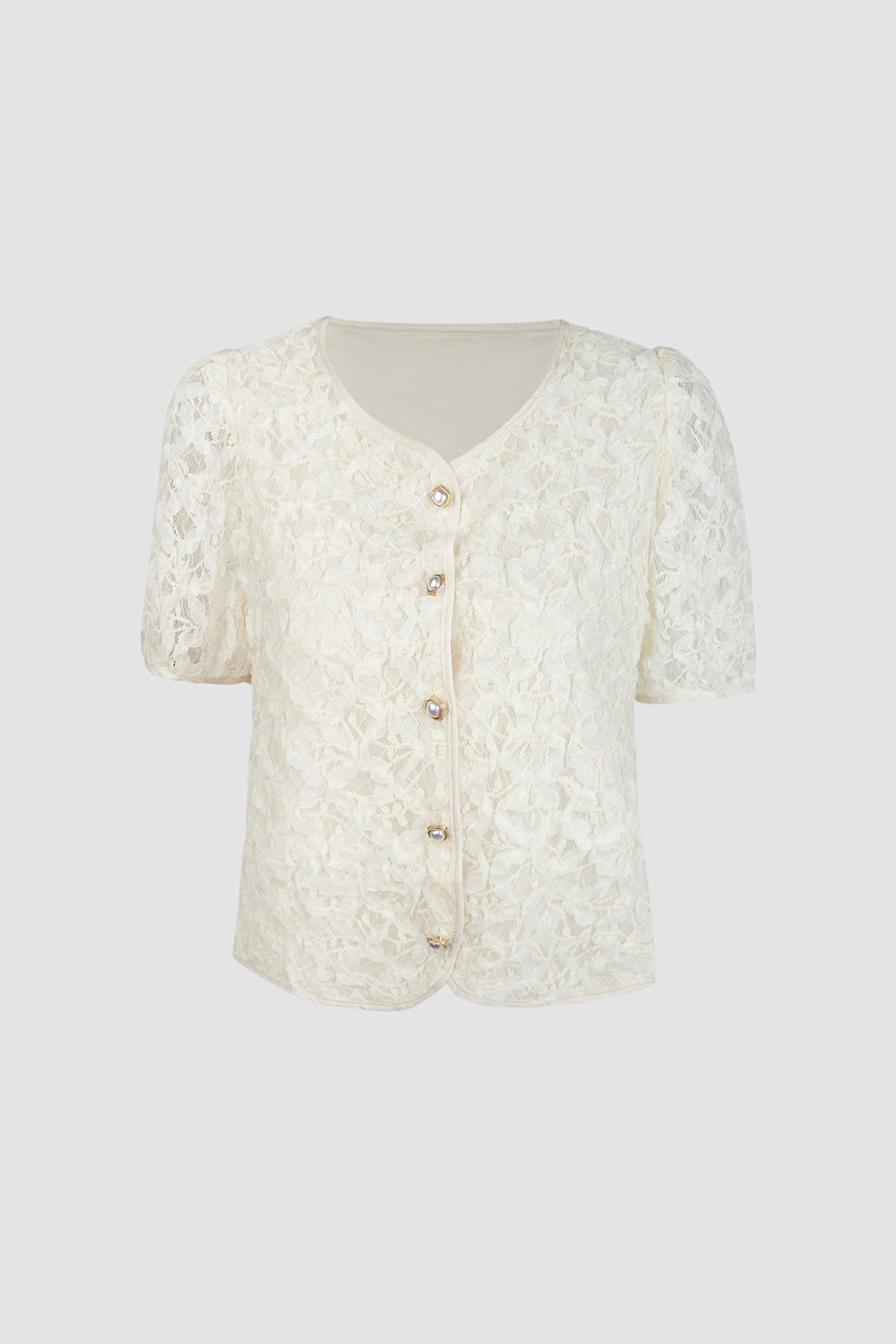Give your look a seriously chic update with this top. Featuring a textured floral design with a button front and short sleeves. style with high waisted jeans and mules for a catch up with girls.