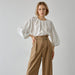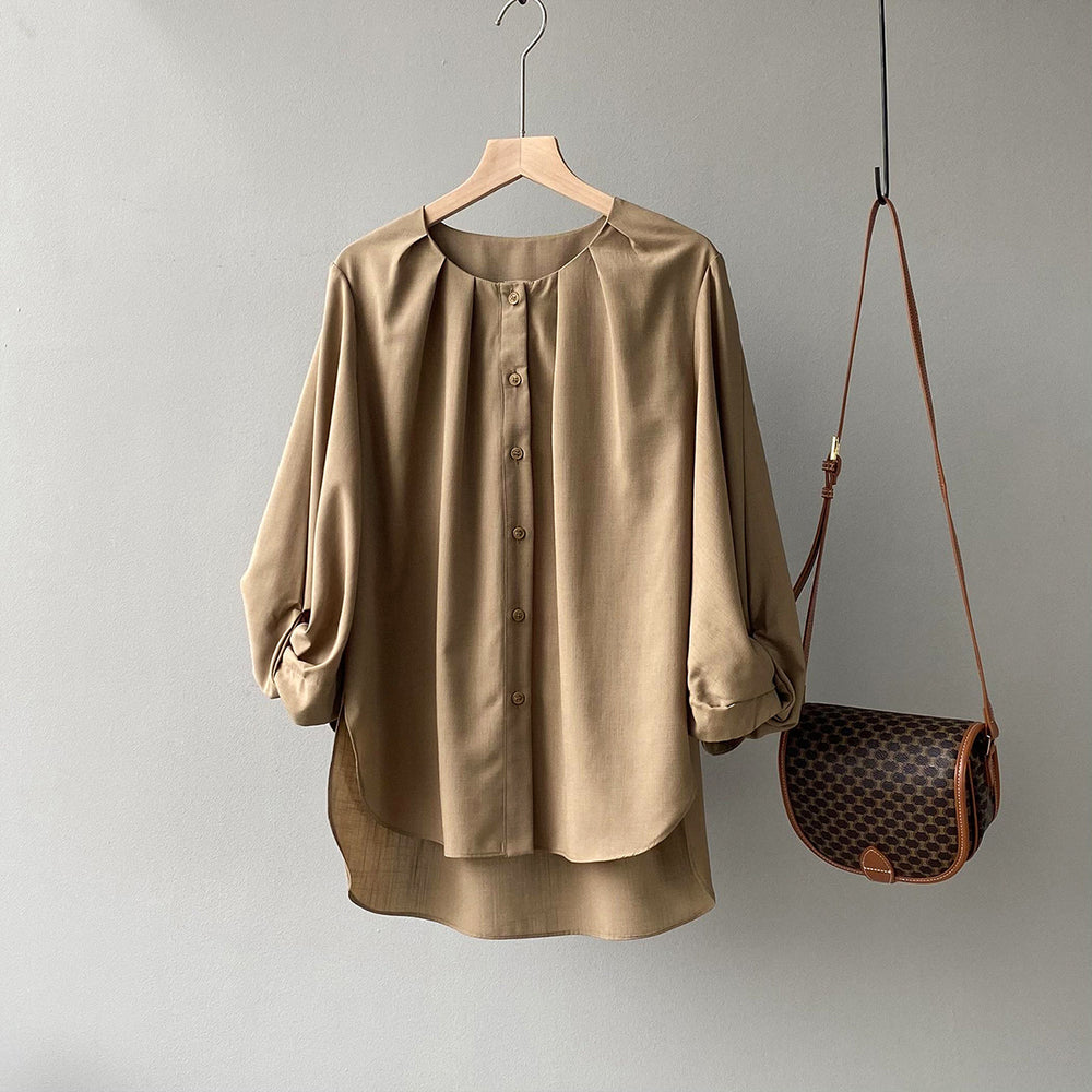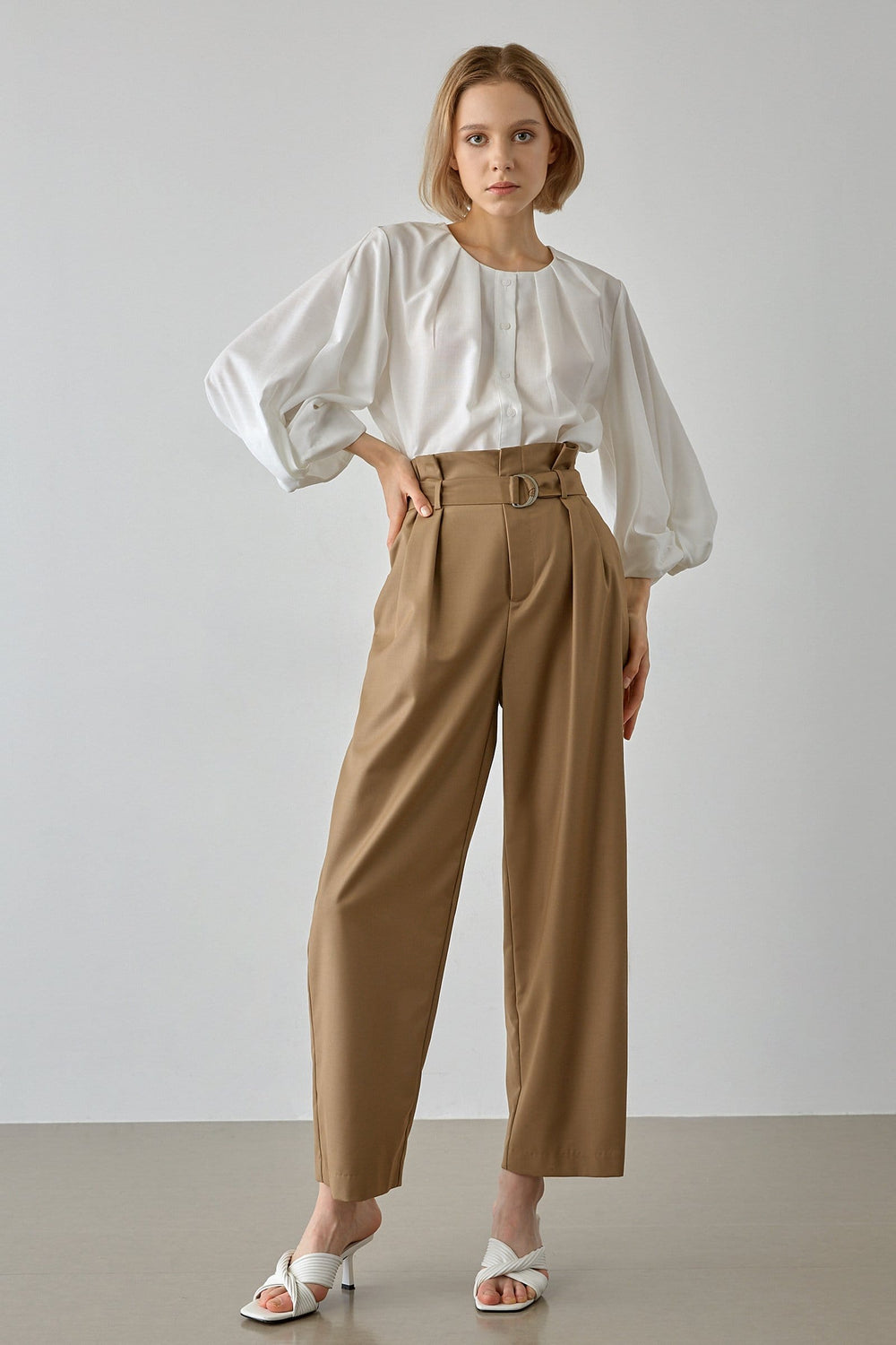 A slouchy shirt features a round neckline. a frilly bodice. puff sleeves. a split ham and a long fit. Available in tan and white. Pair with wide-leg slacks for a casual look or tuck the top into trousers for a more formal lookQ