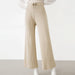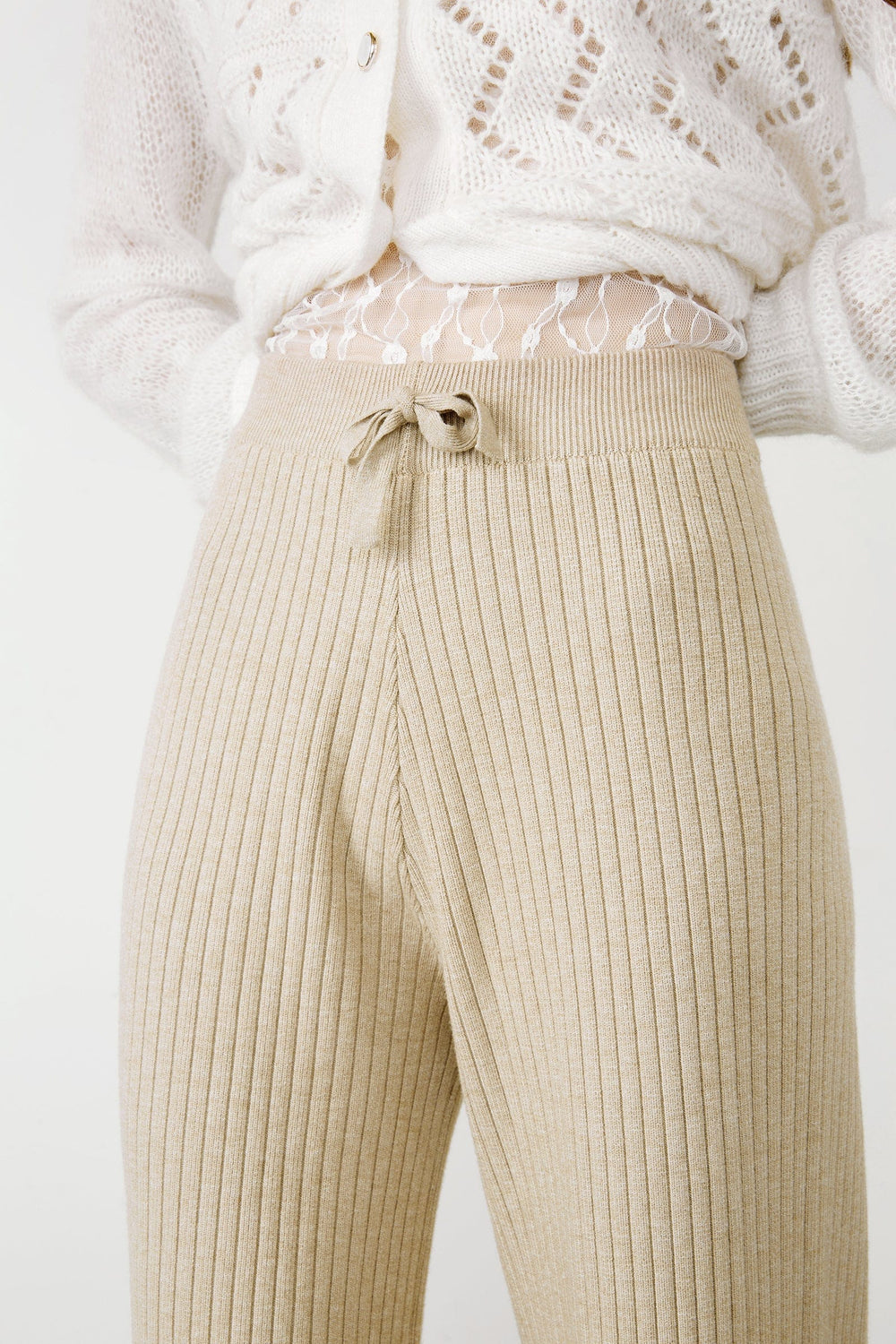 These knit pants feature a high waistline. a wide legged fit. and a drawstring decoration. Made of acrylic and available in beige. black and light grey. Feel comfortable out on the town or lounging at home.