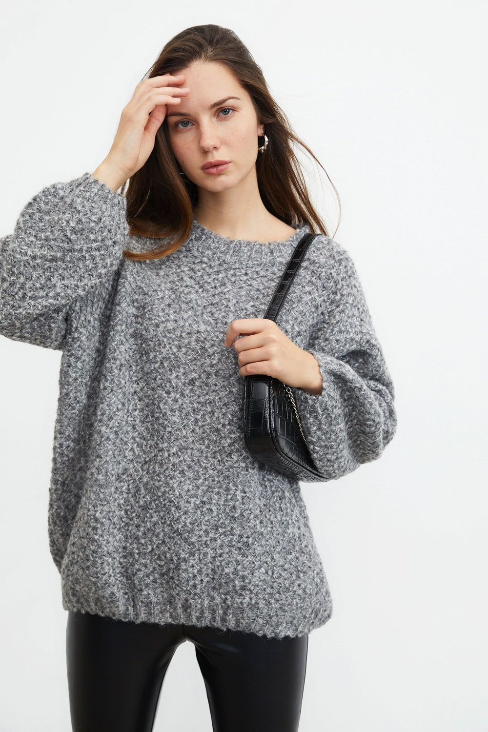 All the buzz. no bees. A cozy grey beehive knit sweater featuring a round neck and long sleeves. Stay warm. not swarmed.