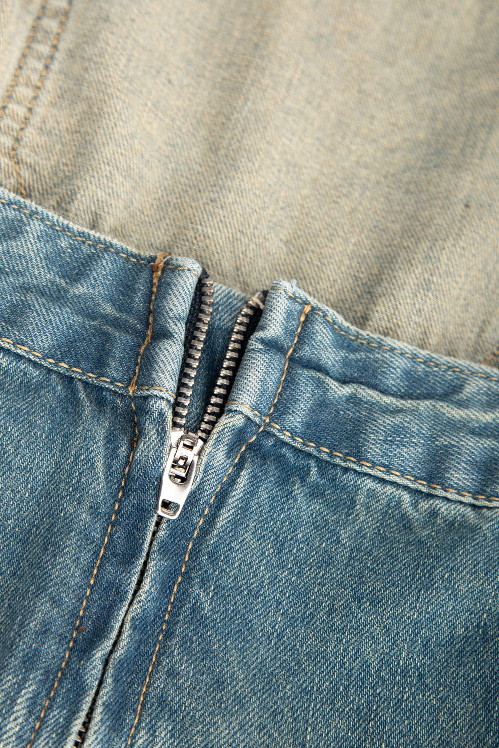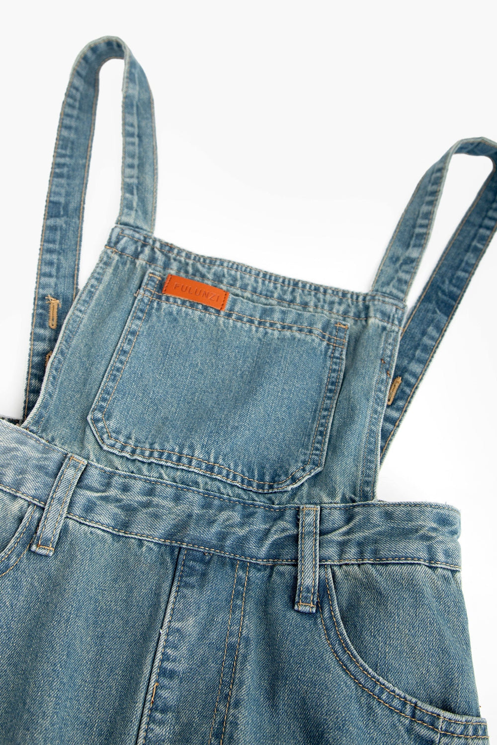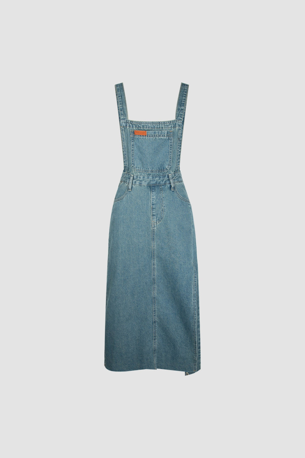 Take your look to new heights with this denim overall dress. Midi overall dress in cotton denim. Adjustable suspenders with metal fastener. seam at waist. and buttons at sides. Bib pocket. front pockets. and back pockets and a side slit.