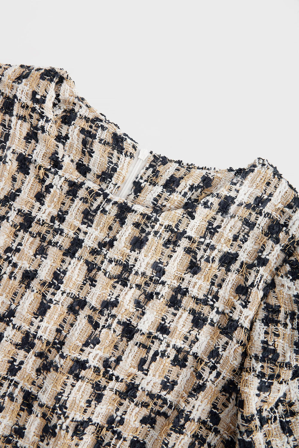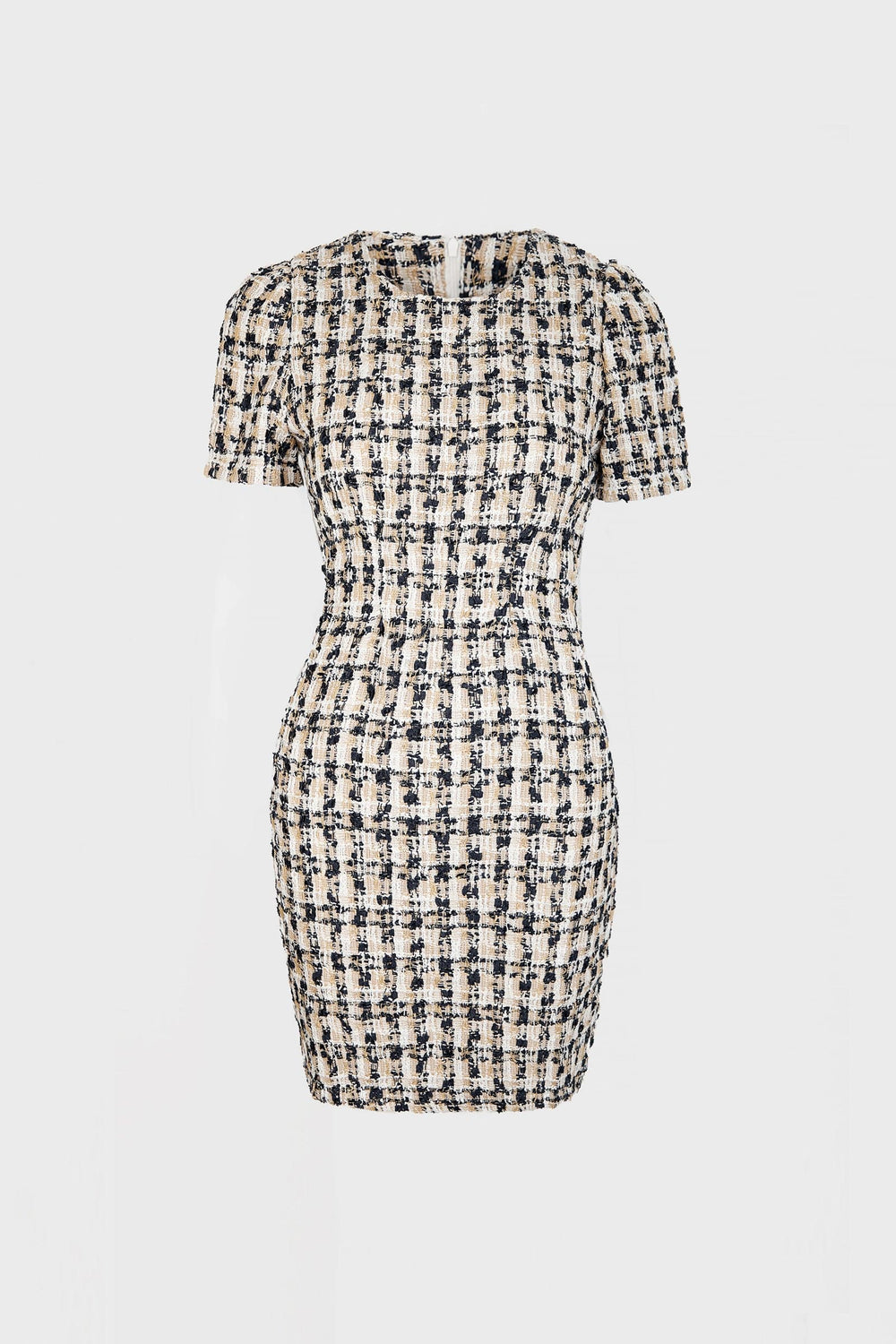 Step into the new season in this sophisticated mini dress. Figure-flattering waisted style. Detailed with a crew neckline and short. puff sleeves.