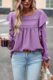 We just can't wait for you to check out this blouse! It's so feminine and cute! The ruffled detailing around the neckline and shoulders is perfection! You are going to love styling this blouse with chic trousers or jeans! This blouse features long sleeves with an elastic cuff. a round neckline. and ruffled detailing.