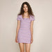 Add some stripes to your look this season with this mini dress. Featuring a multicolored striped rib-knit material with a square neckline. short sleeves and a figure-skimming fit. Team this dress with casual heels and hoop earrings for a comfy look.
