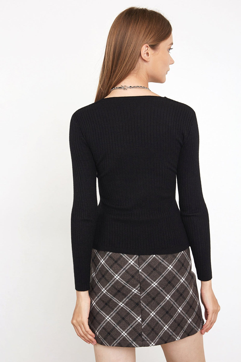 Sexy doesn't have to be overly show. This sweater features long sleeves and a v-neckline. The cross-strap shape makes it perfect showing the body curve. Made of viscose and polyester. Available in white. saddle brown. and black.