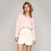 This adorable sweater features a v-neckline. a rhinestone decor. and an oversized fit. Made of polyester and nylon. Available in white. light pink. and pale turquoise.