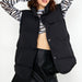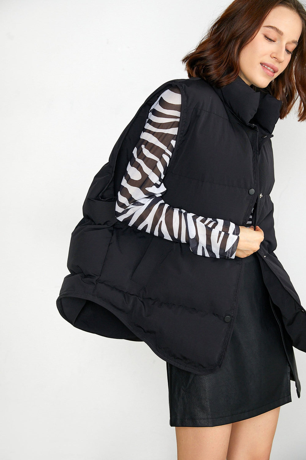 Basic yet functional! This simple puffer vest features a stand collar. center front zip closure. and utilitarian pockets. Pair with sweater or blouse for a layered warm outfit. Made of polyester and cotton. Available in black and tan.